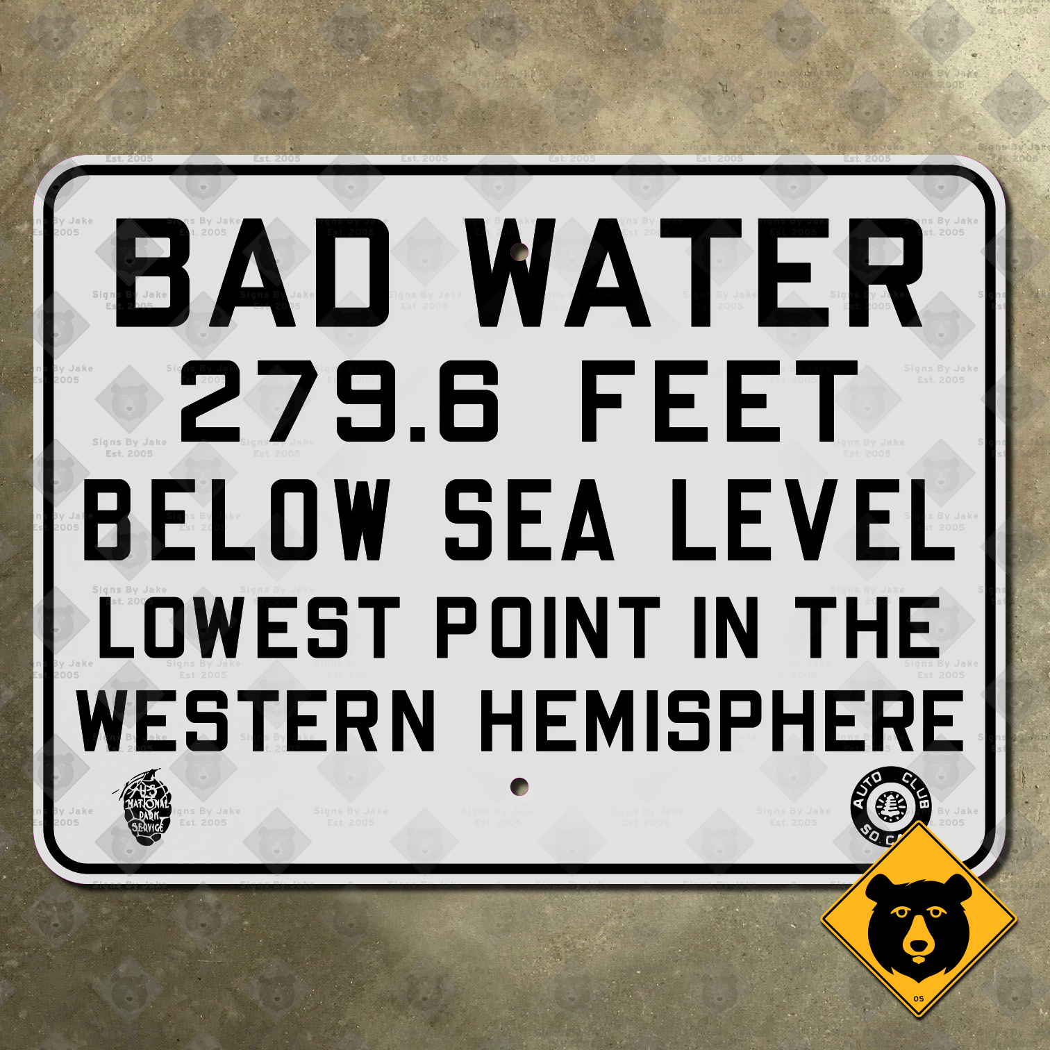 Our Bad Water, 279.6 Feet Below Sea Level sign is a precise recreation of the sign that was posted at the sign that was posted in the basin in 1934. It identifies the location as the lowest point in the western hemisphere (which is no longer true, as a lower spot has been discovered in Argentina since then). At the bottom of the sign are the logos of the National Park Service and Automobile Club of Southern California (who was responsible for making and installing the sign). It is unknown what happened to the original sign; chances are it was sold for scrap long ago. Bring it back to life with our faithful replica.