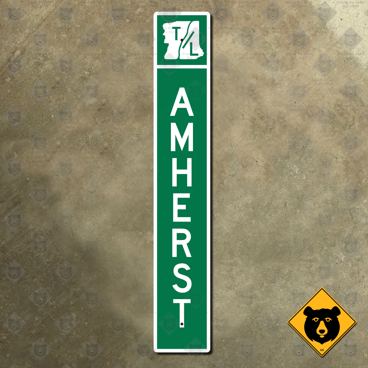 Our Amherst town line sign is made of 14-gauge steel, printed right here in the USA. With a durable, high gloss, non-reflective finish, it will serve you well for years to come, either indoors or outdoors. We offer it in both the original size of 8 in. × 48 in., as well as a scaled-down 5 in. × 30 in. for more economical display. To make installation fast and easy, both versions have mounting holes pre-drilled.