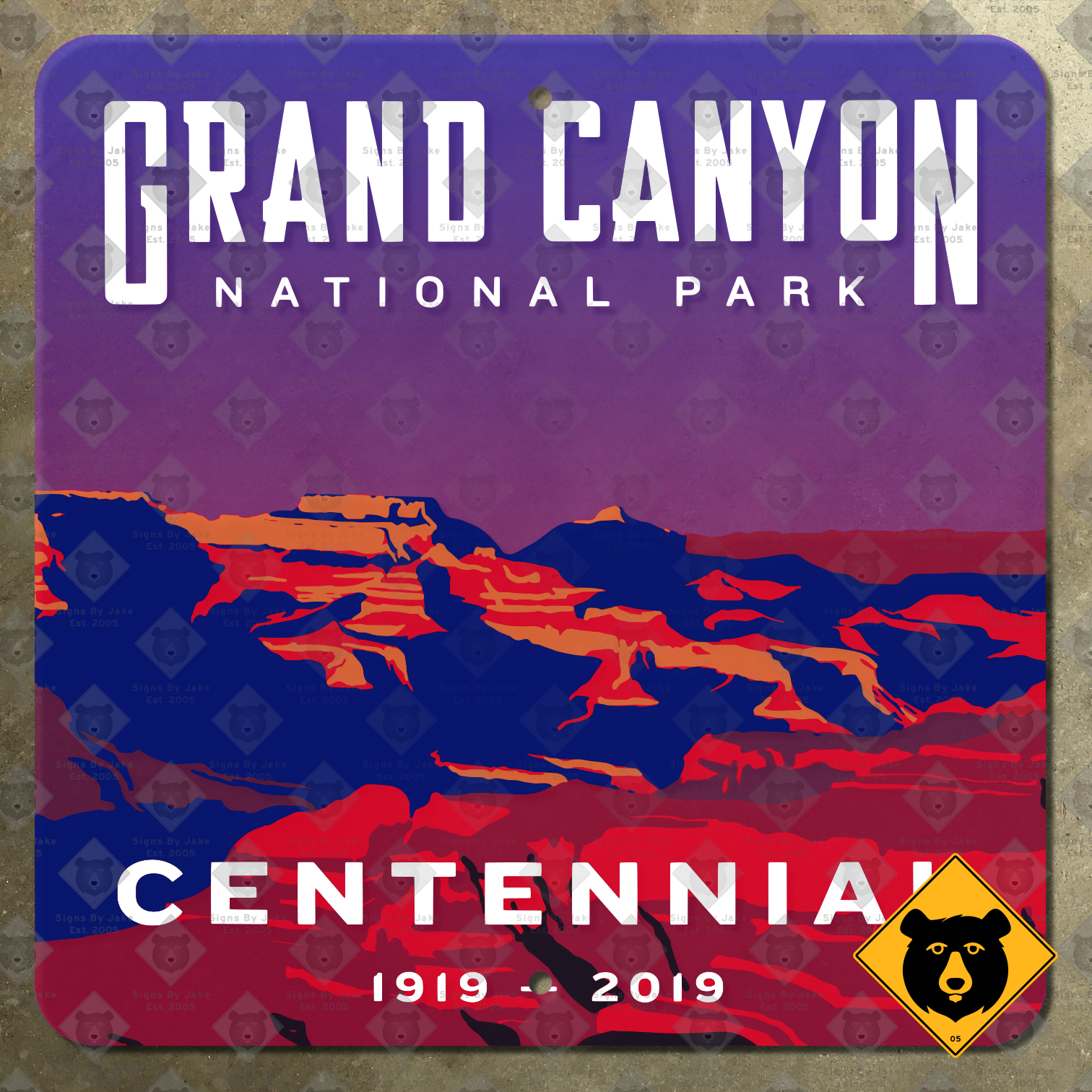 Our Grand Canyon National Park Centennial sign is a faithful recreation of the original markers installed throughout Arizona. It depicts the splendor of the Grand Canyon in beautiful reds, blues, and oranges. Our recreation is flat printed on heavy-gauge steel, with completely accurate layout and fonts. We’ve made it available in sizes ranging from 12 inches square up to 36 inches square; all sizes are precise rescalings of the original 12 foot freeway style sign down to a much more manageable size.