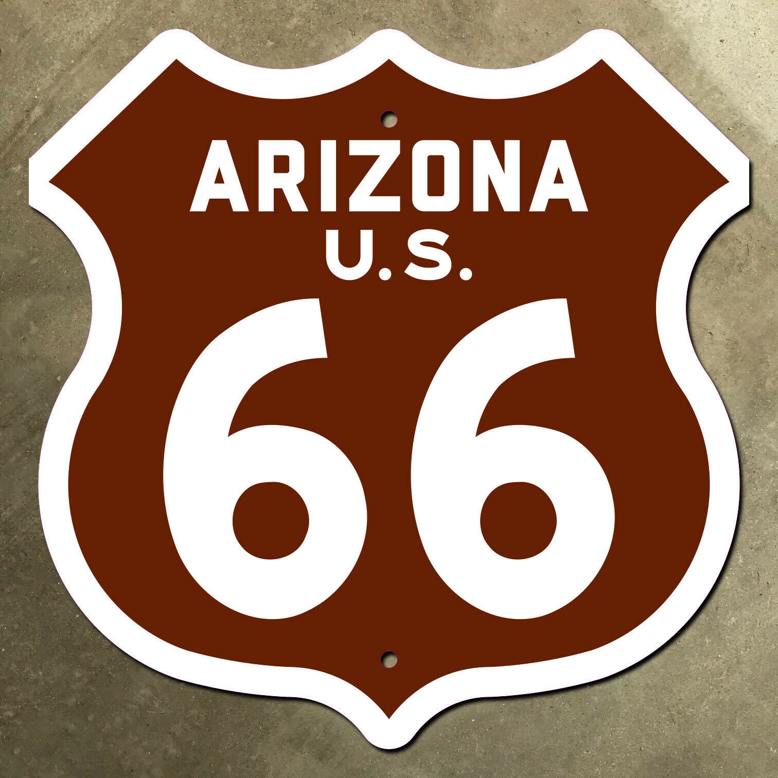 Our Arizona US-66 colored route markers are printed on rugged 14-gauge steel. The non-reflective, high-gloss coating looks great indoors, but is durable enough to take a beating from the elements outdoors as well. These markers will even hold up to the Arizona sun! Choose from sizes ranging from roughly 12 inches square to 36 inches square (due to variations in spec over the years, there is some variation between designs). All sizes include two convenient mounting holes. (Want a colored route marker from one of Arizona’s other routes? Or perhaps another sign from Arizona or elsewhere? We can help! Just contact Jake to place your custom order.)