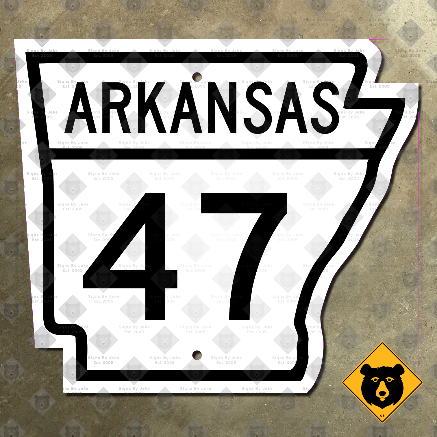 Step back in time to the 1970s with our replica of the 1961-style Arkansas Highway 47 sign. This style was the last one to be “cut out” in the shape of Arkansas. The word “ARKANSAS” appeared at the top of the sign, with a divider bar just below it, and the route number in the main body of the state shape. The 1961 series is the only cutout Arkansas marker that used the modern highway fonts in use today. Because of the route’s short length, you are extremely unlikely to come across an original; it’s pretty likely none still exist. It’s likely to cost you a small fortune if you find one. Get the exact sign you’re looking for, while avoiding the perils of the collector’s market, with one of our faithful replicas.