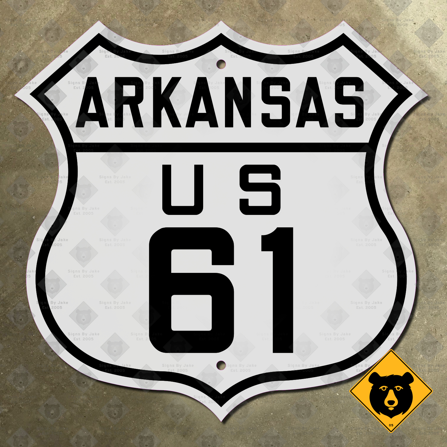 We’ve recreated the Arkansas US-61 route sign according to the exact 1926 state standards; this style of sign was used between then and the late 1940s. It uses the square block fonts typical of that era’s signage. We’ve spared no effort in making sure this sign is a precise duplicate of the original—every detail, from the curves of the shield shape to the exact placement of the text, is just like the real thing!