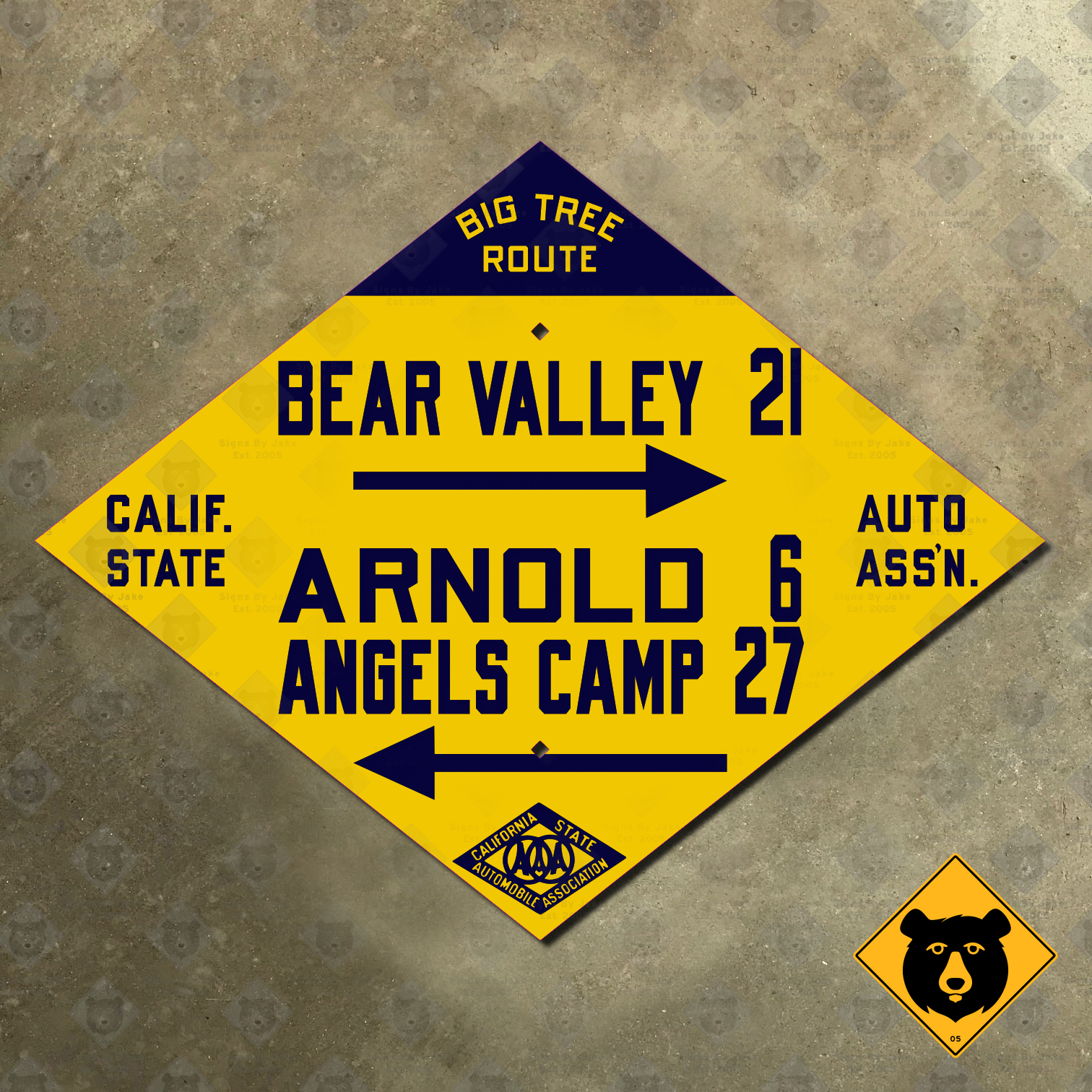 We’ve brought this classic directional sign back to life for your enjoyment in the modern day. Our replica Bear Valley, Arnold, and Angels Camp directional sign is made to the 1919 specifications used by the CSAA. It includes the diamond-shaped logo at the bottom of the sign (as well as the association name at the sides) and with sharp corners. With our replica, you can hold a piece of California history in your hands…at a fraction of the price of an original.
