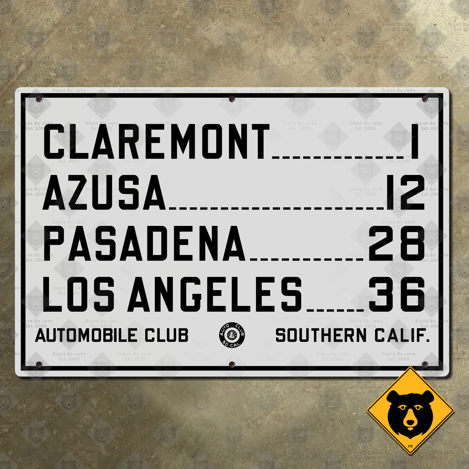 Before the mid-1950s, the state of California did not post street signs on its public highways. That task was performed by private automobile clubs; in the south half of the state the Automobile Club of Southern California took on that duty. This is an example of an ACSC mileage sign that would have appeared on historic US Route 66 one mile east of Claremont. Route 66 followed Foothill Boulevard from Claremont through Azusa, then Huntington Drive and Colorado Boulevard to Pasadena, where it transitioned onto the Arroyo Seco Parkway (later known as the Pasadena Freeway) toward downtown Los Angeles.
