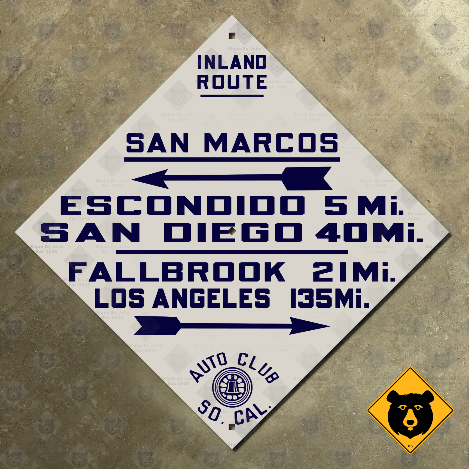 Our replica Inland Route sign from San Marcos is flat printed on heavy 14-gauge steel. Its glossy, non-reflective finish is not only a close match to the porcelain finish of the original, it makes it durable enough to be installed anywhere, even outdoors under the bright Southern California sun. For maximum historical accuracy, we offer this sign in the original size of 18 inches square (about 25½ inches up and down between the points). We also have a scaled-down 12-inche-square (about 17 inches up and down between the points) version, for those seeking to save space or money. Both sizes include mounting holes to make installation simple. (We can make a sign just like this for any set of destinations, in any size! We can also make just about every kind of road sign from all over the world. Just contact Jake to get started on your custom order today!)
