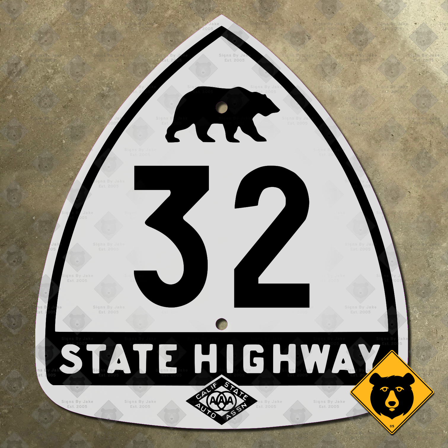 Our California State Route 32 sign is a precise replica of the earliest signs that were used to mark this historic highway. This style was manufactured and installed by the California State Automobile Association between 1932 and 1940. It features the route number in black on a white background, with a silhouette of a California grizzly in the top point of the spade. The words “STATE HIGHWAY” appear below the route number, and at the very bottom is the diamond-shaped CSAA logo. While signs in this style do circulate on the collector’s market, you may be waiting quite a while to find a 32 specifically. When you do, it is likely to command a substantial premium due to both age and scarcity. With our faithful replica, you get a home decor item just as fantastic as the original, at a fraction of the price.