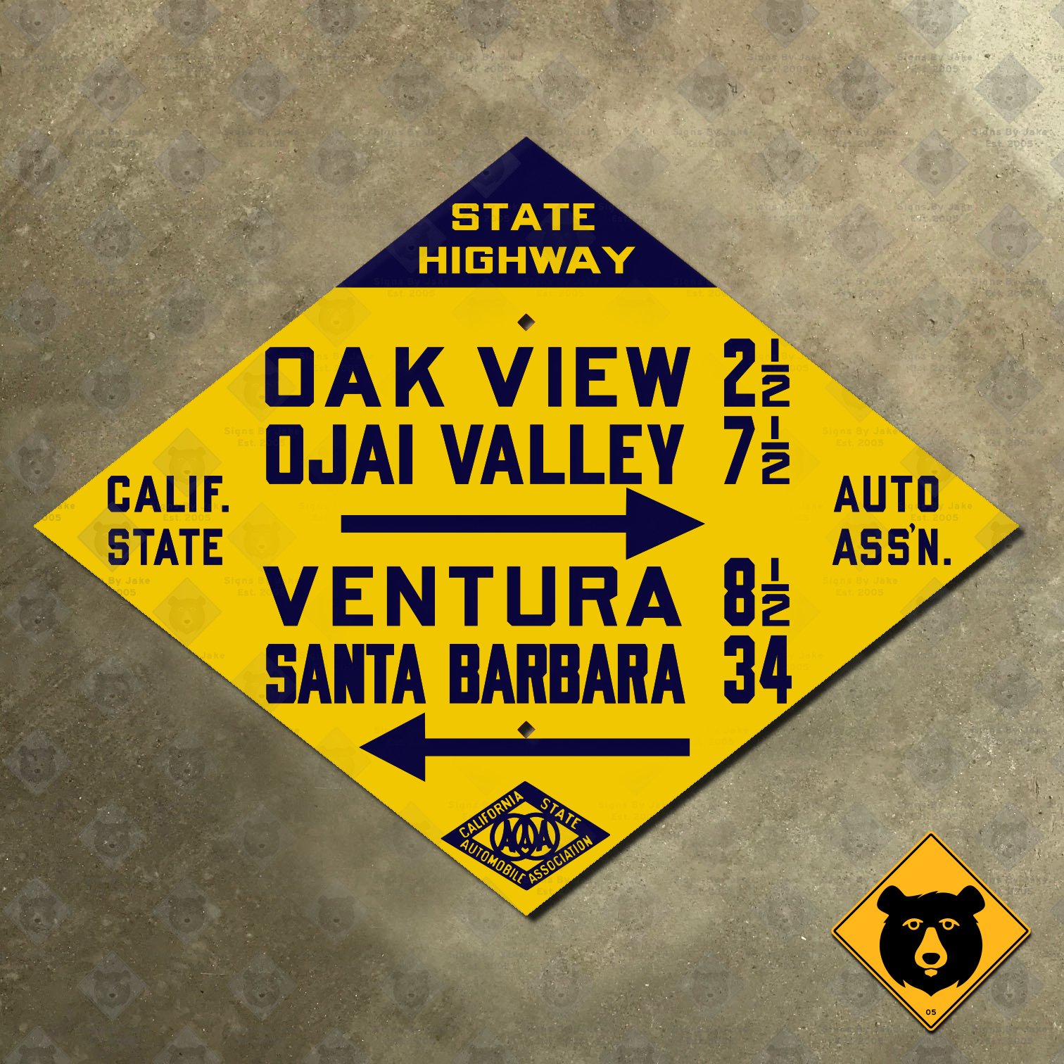 This sign, made in the style of the early CSAA signage, shows the destinations of Oak View and Ojai Valley to the right, and Ventura and Santa Barbara to the left. We’ve used historic photographs of CSAA signage to ensure that every detail is just the way CSAA would have made a sign with these destinations and distances. Show your love for these famous California cities with this excellent display piece!