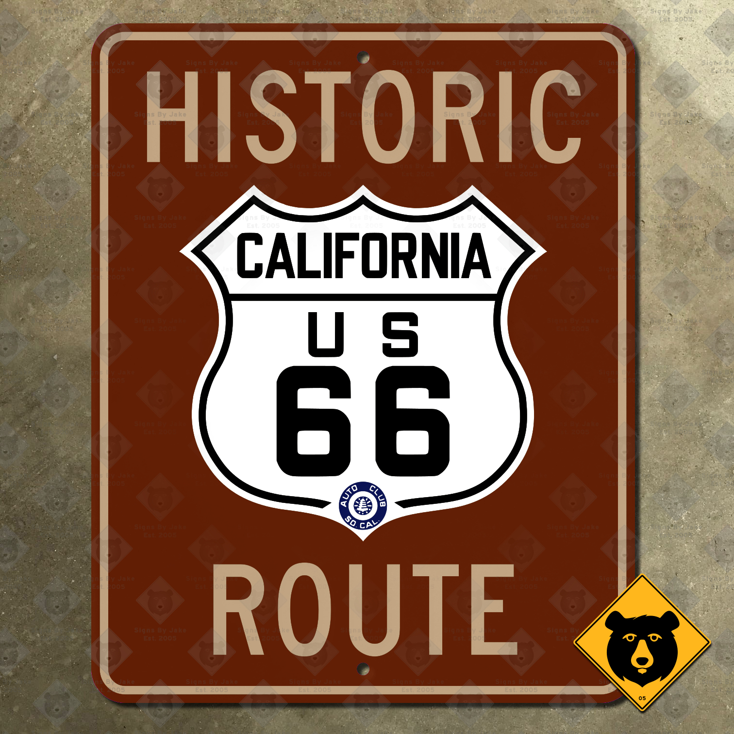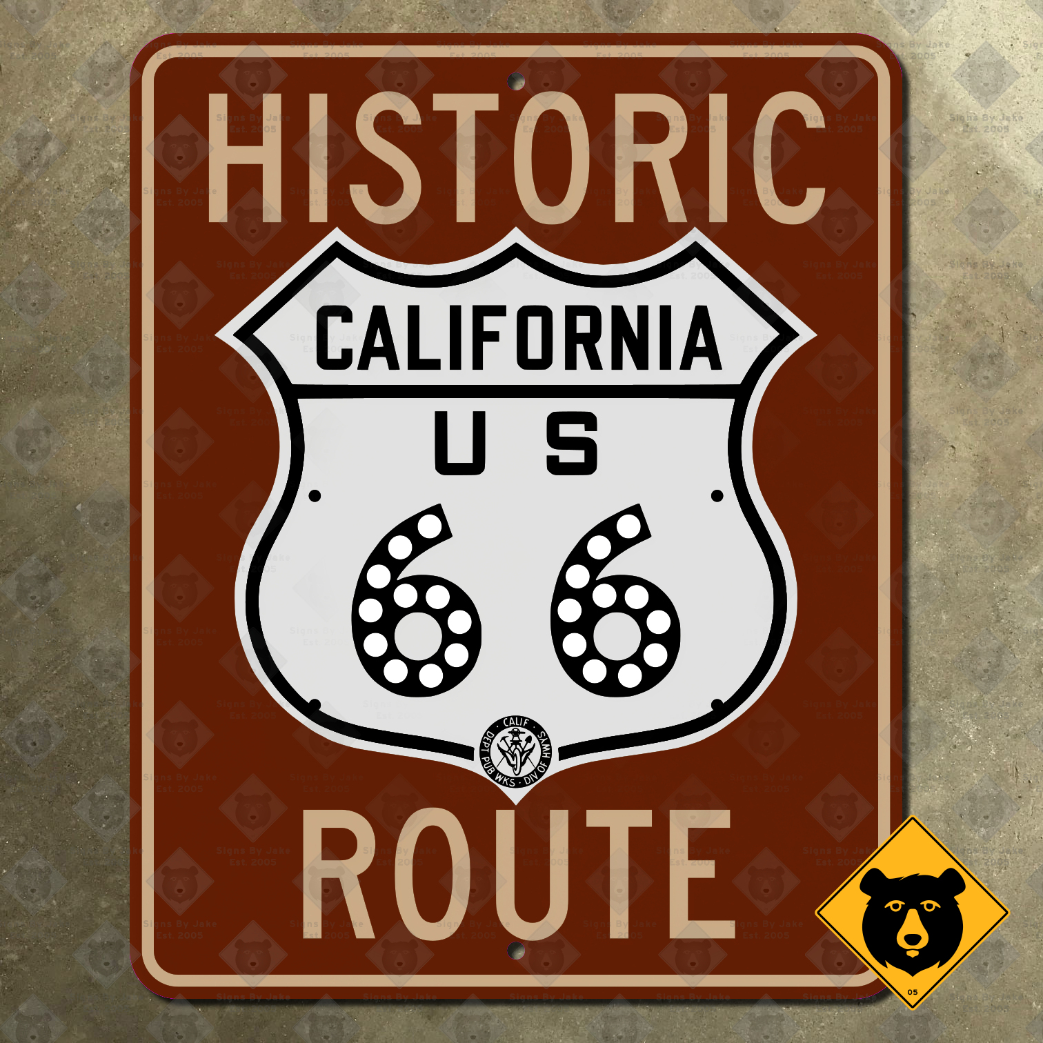 Our replica of California’s US 66 Historic Route signs is made to the exact standards used from 1975 to the present day. It includes a US 66 shield in your choice of two styles used in California: the classic Automobile Club of Southern California style used in the earliest days of the route’s existence, and the California Department of Public Works, Division of Highways introduced circa 1949. The Division of Highways style is printed with extra-bright white dots on the numerals, simulating the Stimsonite reflectors that would have been found on the original sign. The words “HISTORIC ROUTE” appear above and below the US 66 marker. Relive the golden age of American automobilia with our replica; it makes a perfect addition to your garage, bar, man cave, or anywhere else needing a touch of Southern California flair!