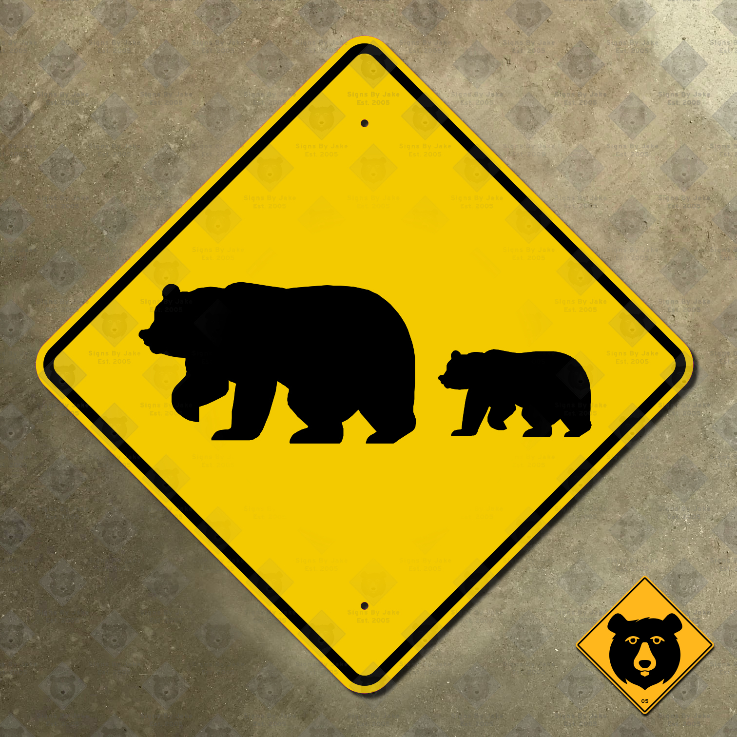 Our bear crossing warning sign is an exact replica of those used in the states of California and Nevada. Although the federal Manual on Uniform Traffic Control Devices has a bear warning sign, it has only one bear on it, while the California–Nevada version has two. Twice the bears means twice as good of a sign, so we chose this one to add to our library. We’ve used the California Department of Transportation SW59 signage specification, dated August 5, 2003, to make this sign. Our replica looks just like the original signs because, mathematically, it is just like the originals! Please note, however, that our replica is not retroreflective because it is intended as a display piece only, and therefore does not meet the standards required for installation on a public roadway.