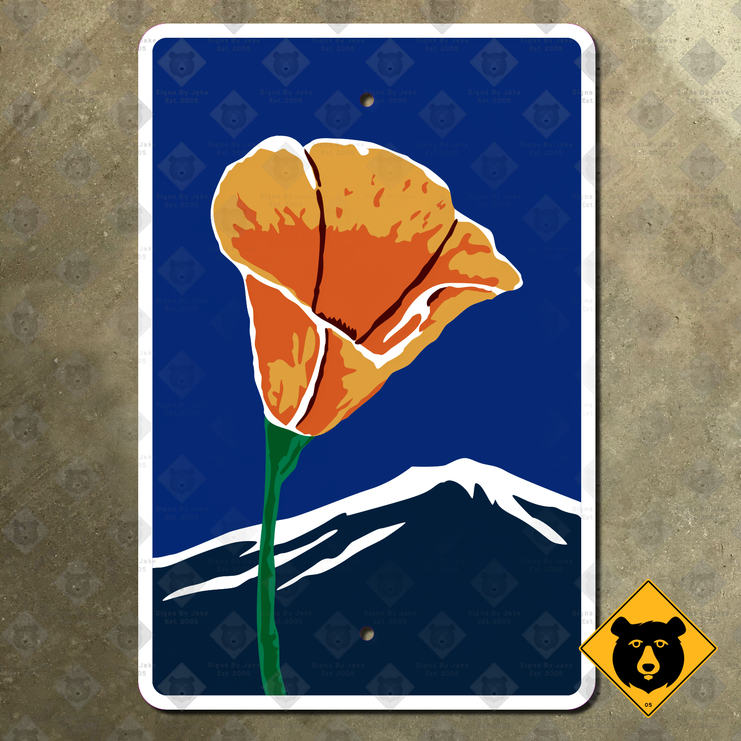 The California poppy scenic route marker is a familiar sight to anyone familiar with the Golden State’s roads. Since November 11, 1971, Caltrans has used it to mark the many scenic roads winding their way through the state. It depicts a California poppy, the state flower, with a snow-covered mountain in the background. This version of the sign, which normally appears alongside route markers, is a cropped version of the larger California scenic route sign that appears at the beginnings and endings of scenic routes.
