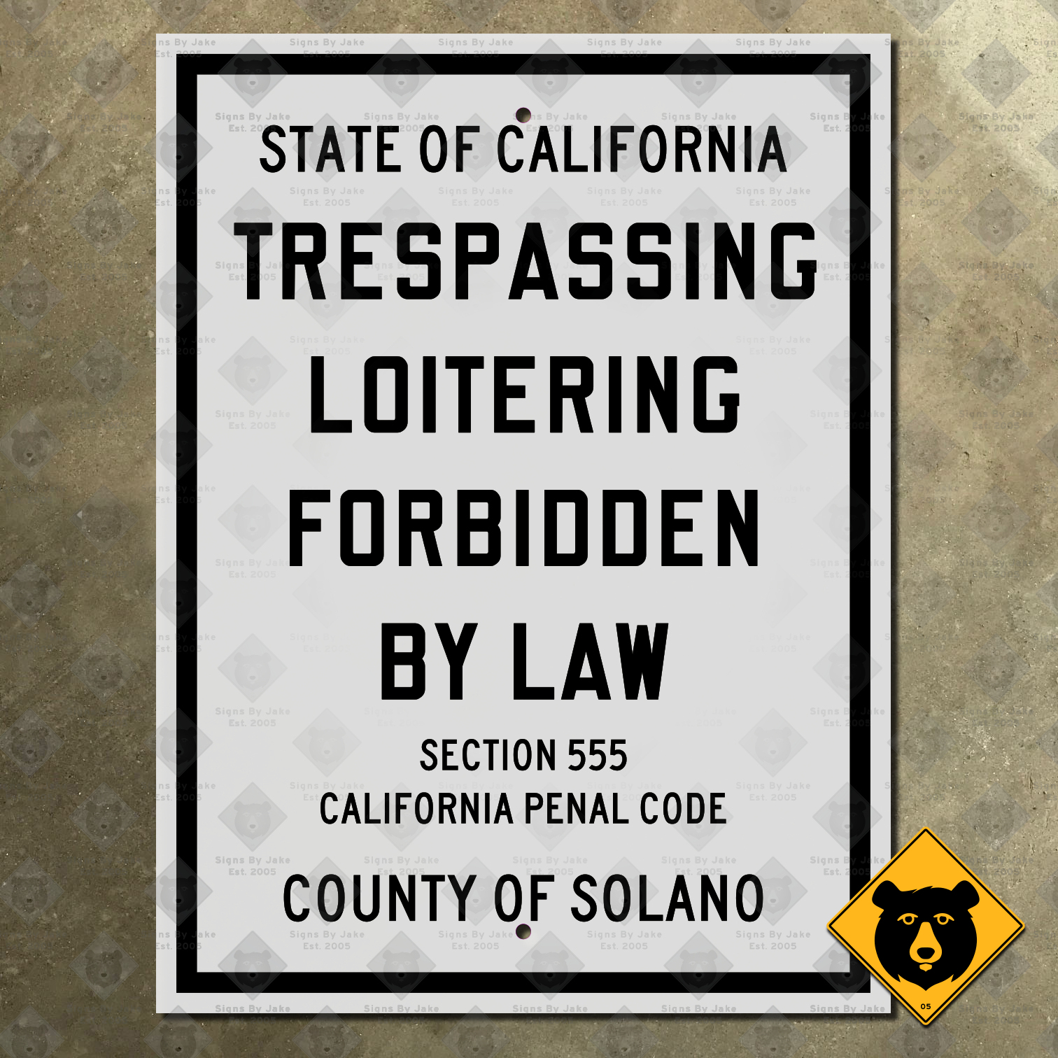 Our Trespassing and Loitering Forbidden By Law sign is made to a 1950s standard that elegantly replicates the old-school look of porcelain signage of the era. It includes the additional warning that doing so may be in violation of Section 555 of the California Penal Code, as well as identifying Solano County as the relevant jurisdiction. Please do note that while this remains a law on the books, and common sense dictates that a sign like this at the edge of your property would provide seemingly adequate warning against ne’er-do-wells, scofflaws, and other species of riffraff, laws differ from jurisdiction to jurisdiction, so please check with a lawyer before ordering something you intend to use as an actual deterrent, versus an attractive display sign.
