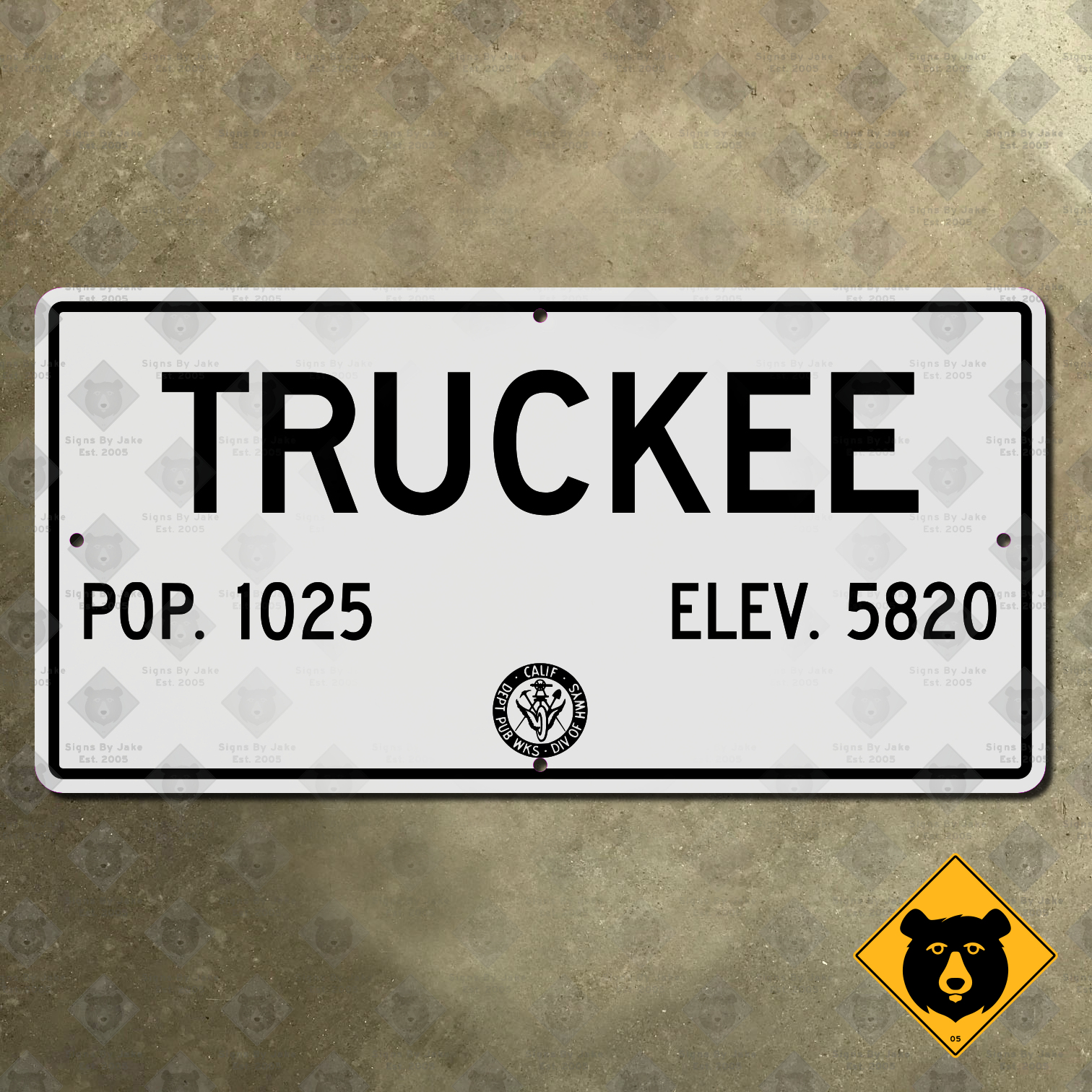 Our replica Truckee city limit sign is made to the exact standards used by the California Department of Public Works, Division of Highways, from 1947 to 1956. Under the town name is the population, 1025 people, and the elevation, 5,820 feet. The logo of the Division of Highways appears at the bottom center of the sign. Our replica is just like the real thing; it uses the standard road sign fonts and every element is placed exactly where it would be on the original.