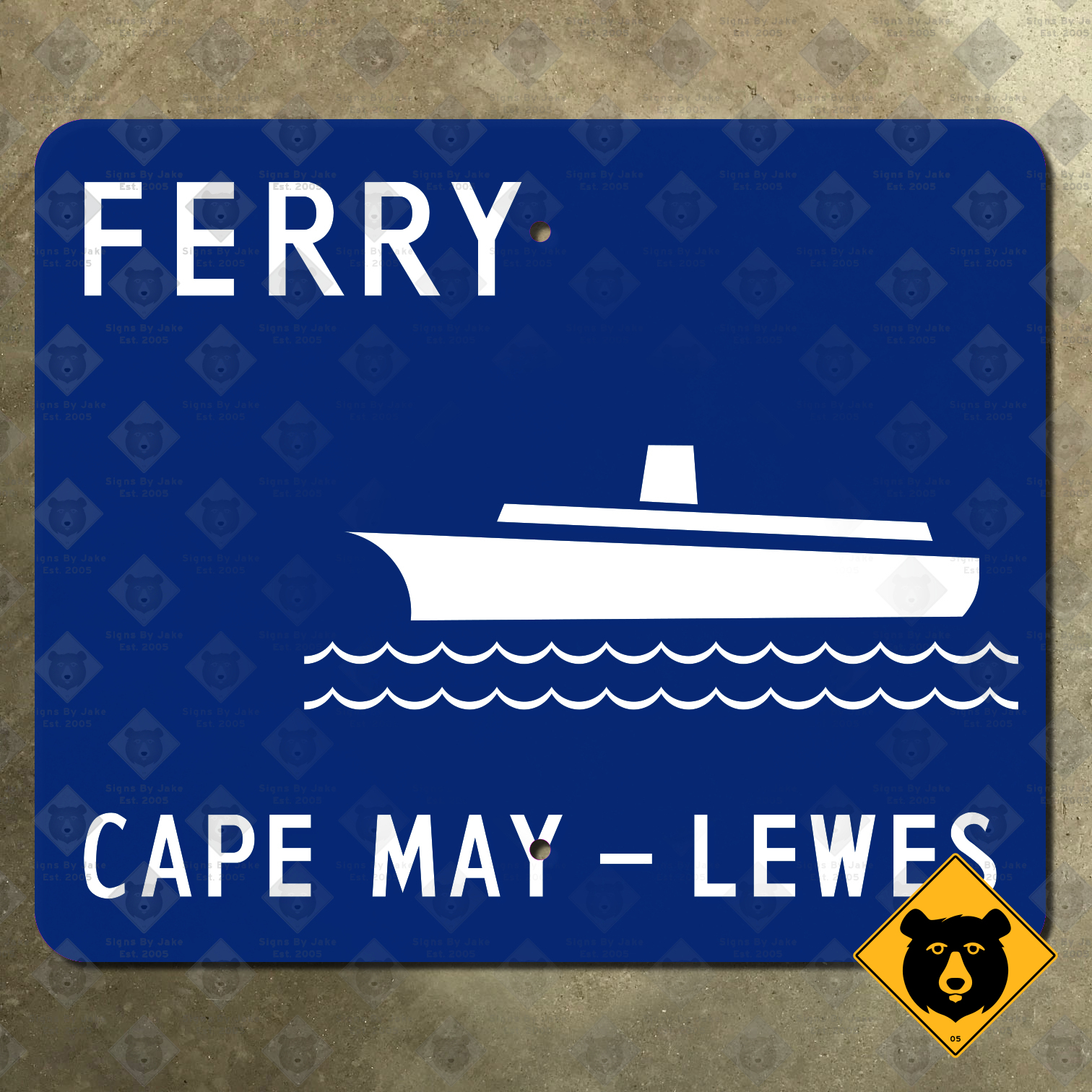 When the Cape May–Lewes Ferry began service in 1964, distinctive blue signs marked the route to the ferry terminals. These signs featured a stylized depiction of one of the ferry vessels crossing the waves of Delaware Bay. In 1974, the ferry became a part of U.S. Route 9, which follows the ferry route to this day.