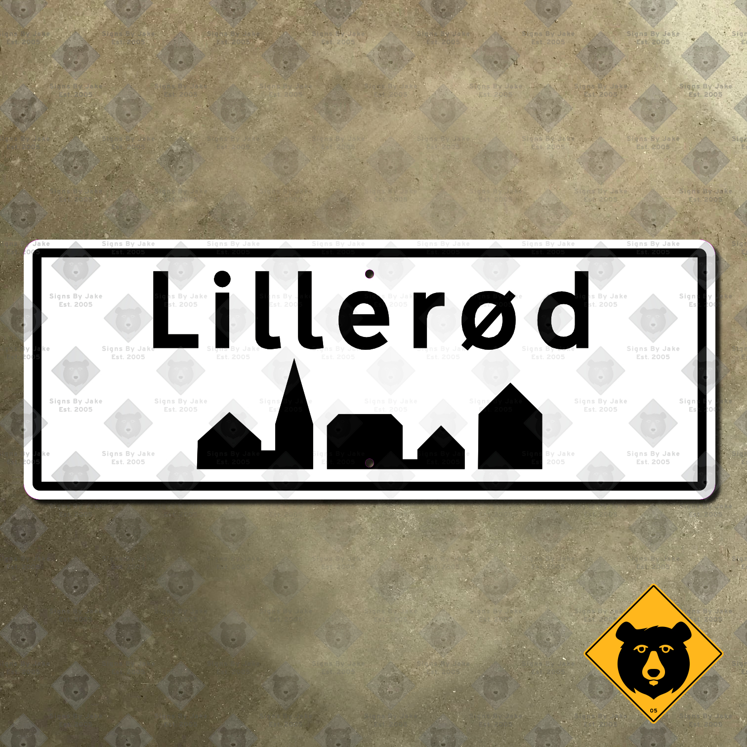Lillerød is a town on the island on Zealand, in Denmark. Travelers entering the town by road will be greeted by a standard Danish city limit sign. These signs all have the name of the urban area (in this case Lillerød) above a pictogram of a typical Danish town. Leaving town, a nearly identical sign is posted, this one with a red slash through it to signify the end of the urban area.