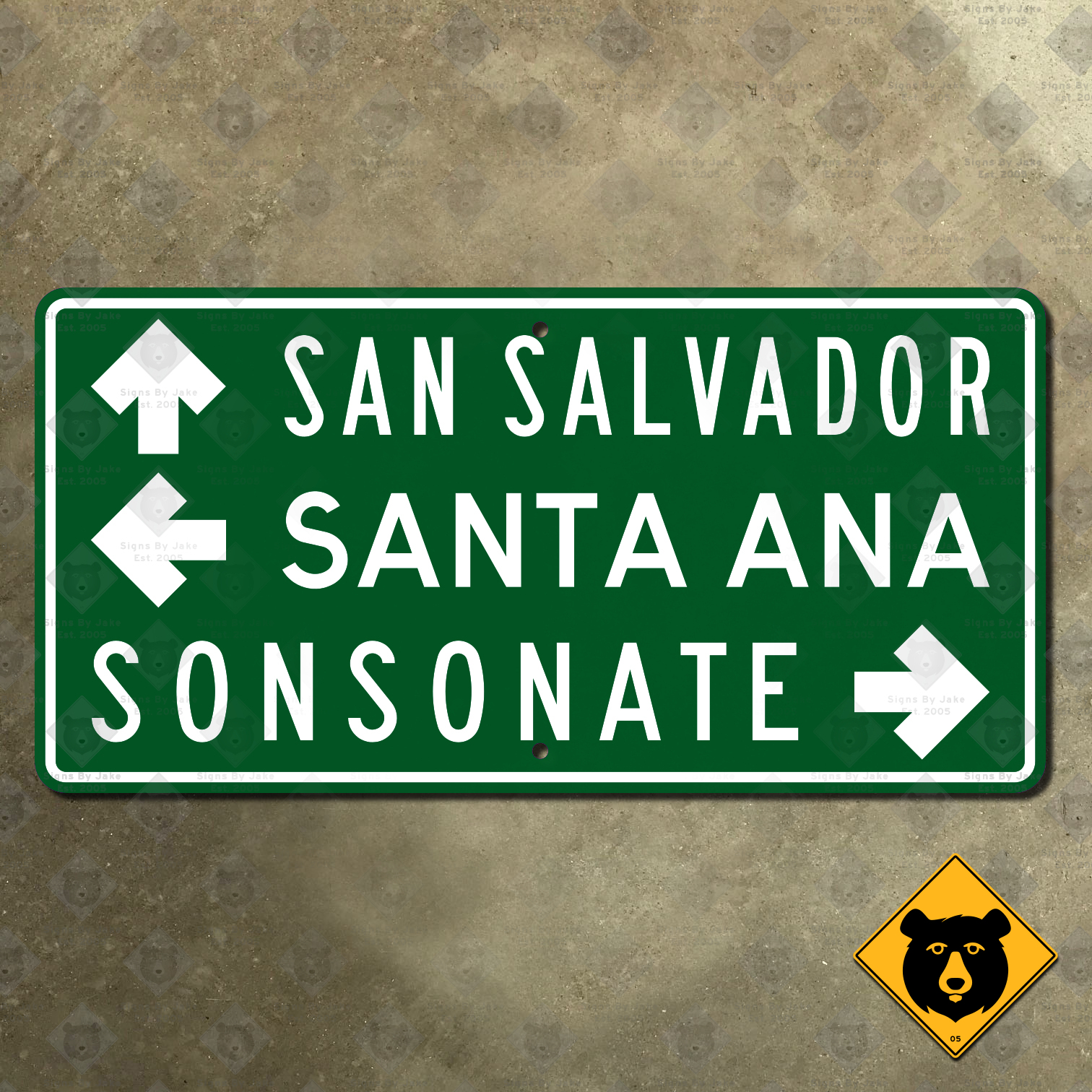 This El Salvador directional sign is based on signage located at a traffic circle on Central American Highway 1 just outside of Santa Ana. It points the way to three major cities: San Salvador, the country’s capital and largest city, Santa Ana, its third-largest city, and Sonsonate, its tenth-largest city. Like many signs in El Salvador, it’s made to the 2014 standards published by Mexico’s Secretaría de Comunicaciones y Transportes (SCT) in its Manual de Señalización Vial y Dispositivos de Seguridad (Manual on Road Signs and Safety Devices). For added authenticity, we’ve even used the SCT fonts, which are very similar to the American FHWA Series fonts, but with some subtle differences.