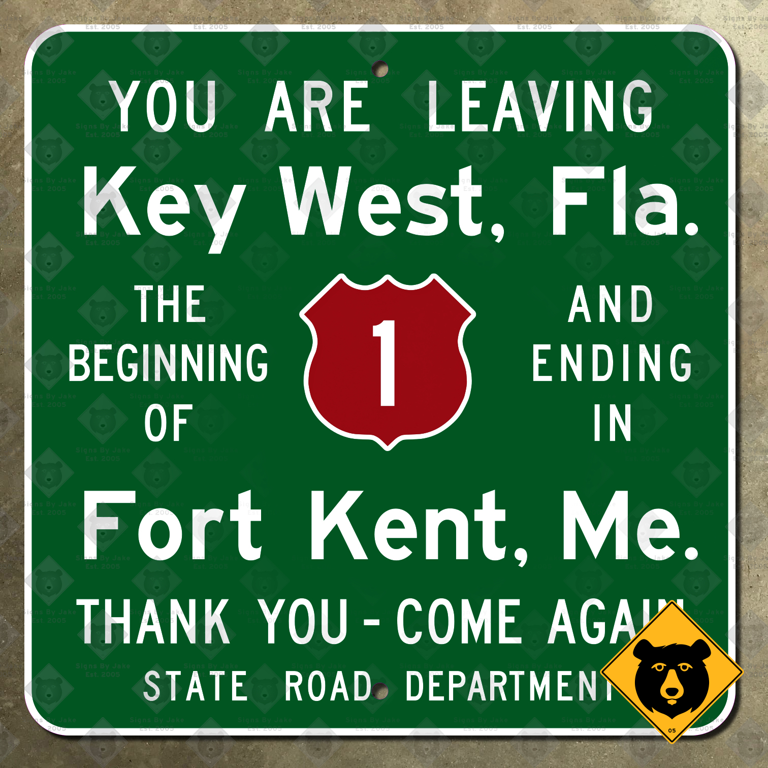 In 1959, the state of Florida posted a unique sign on the Overseas Highway leaving Key West. “You are leaving Key West, Fla.,” it read. “The beginning of US-1, and ending in Fort Kent, Me. Thank you – Come again, State Road Department.” In the center of the sign was a large US-1 marker; it was red to match the color coding Florida used for of all of the US routes during this time period. This sign was in place throughout the 1960s and into the 1970s, when it quietly disappeared.