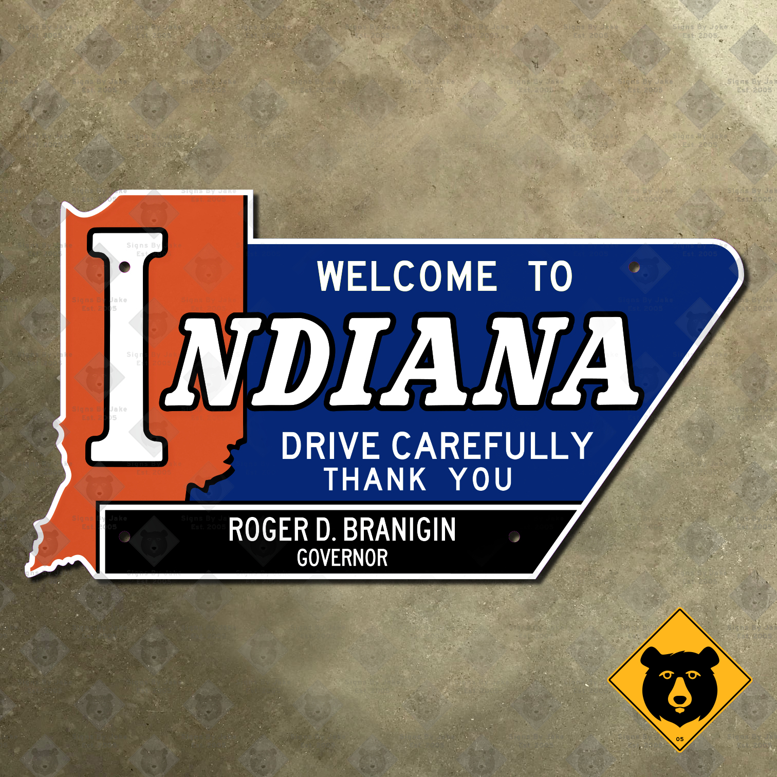Our Welcome to Indiana, Drive Carefully sign is a precise replica of the signs once posted along Indiana’s boundaries. We’ve used historic photographs of the sign when it was in use to make sure every detail is just like the originals. This sign is fully customizable, too—by default we’ll include Roger D. Branigin (served 1965–1969) as the governor, but we can make it with any name—that of a different governor, perhaps, or your wife, your kid, your dog, the fictional character you made up… the sky is the limit!
