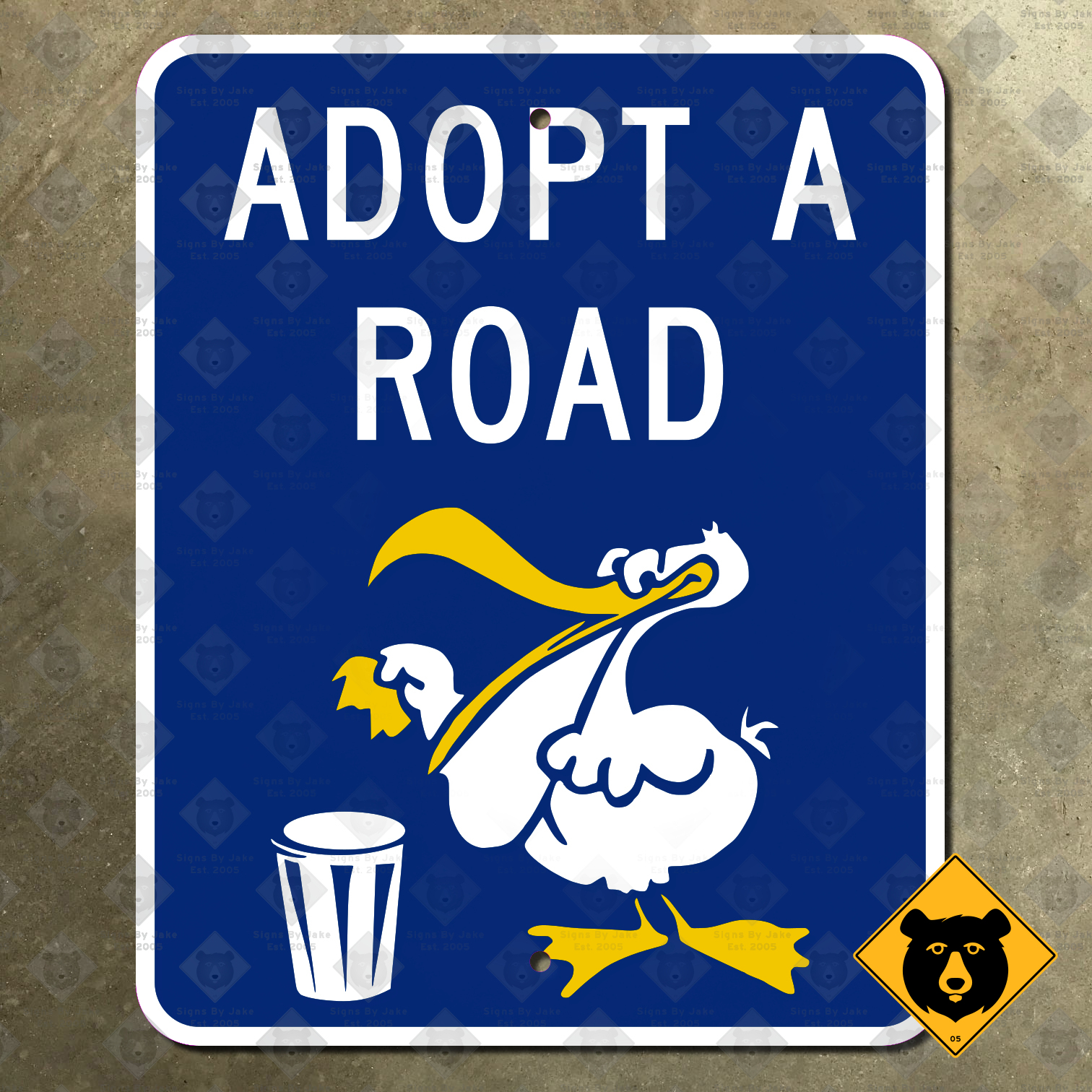 Since Louisiana established its Adopt a Road program, its signs have featured a graphic of a pelican, the state bird. In a disturbing bit of ambiguity, it is preparing either to dispose of, or eat, a piece of trash. Either way, we can be sure the pelican is preventing the litter from reaching the ground. May we all be so vigilant. Although some very minor details of the sign have changed over the years, the same basic design that was used in the 1980s is still in use today. It normally appears with a separate sign bearing the name of the group responsible for the road installed beneath it.