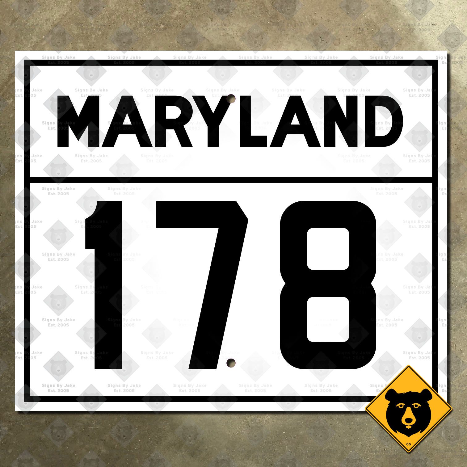 Our Maryland Route 178 sign is flat printed on sturdy 14-gauge steel. It has a glossy, nonreflective finish, durable enough to withstand the elements outdoors but still looking great as part of your home decor. Get it in your choice of four sizes, from 12 in. × 10 in. all the way up to 36 in. × 30 in. Two convenient mounting holes are included. (We can make this route marker with any number you want, in any size you want! We can also make state route markers of any style, from any state or province. You name it, we can do it—just contact Jake to place a custom order!)