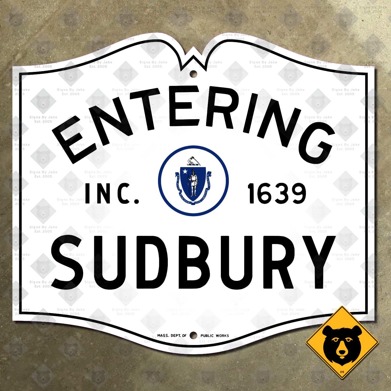 Sudbury, Massachusetts is a city in Middlesex County, in the Boston metro area. Our replica of the Sudbury city limit sign is made according to the 1950s standards for signs of this type. That means it’s a precise duplicate of the original signs posted along the roads leading into Sudbury. This style was in use until about 1975, when the signs changed to having a flat bottom. The sign shows the village’s name and its incorporation year of 1639.