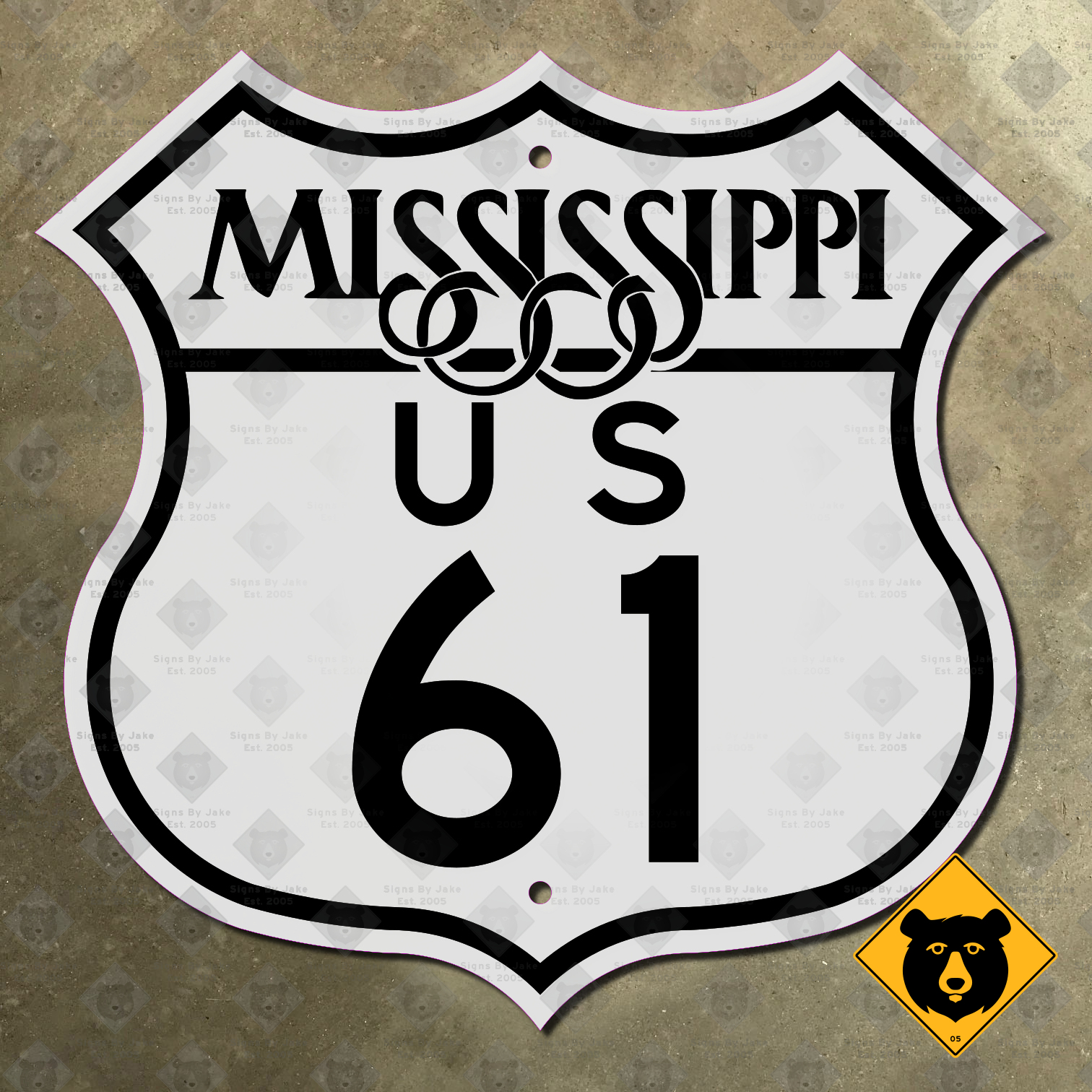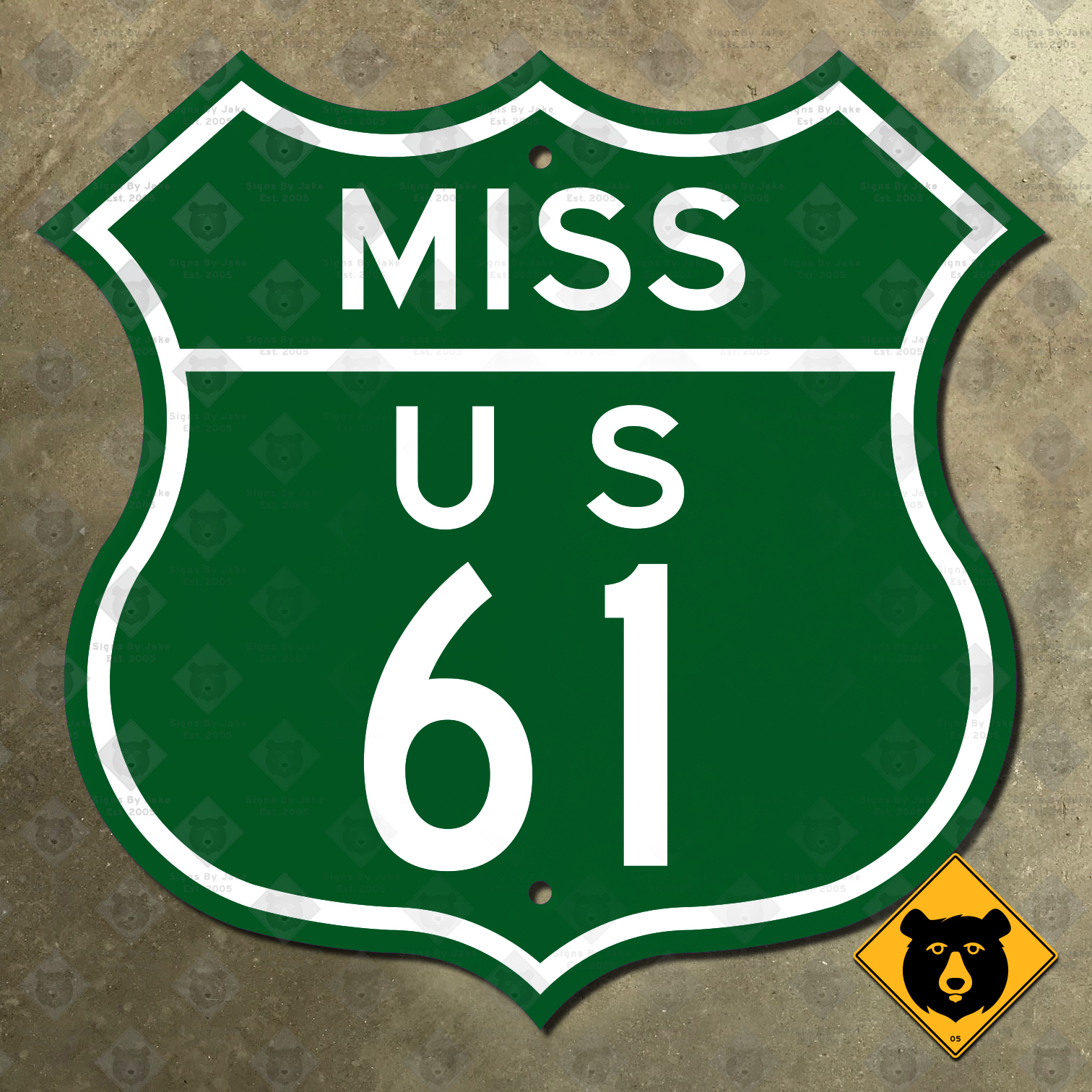 We’ve recreated several iterations of the Mississippi US Route 61 sign for your enjoyment. First is the classic 1926 standard, with the block fonts that were standard for the era nationwide. Around 1946, like many states, Mississippi began experimenting with assigning different colors to major highways to aid in navigation. Under this scheme, all US-61 markers in Mississippi were colored green, with white text. Finally, we present a variant of the 1952 standard, which introduced the modern FHWA Series fonts still used today. Our version of this marker is inspired by a one-off piece created for fun in the Mississippi sign shop. This version uses the iconic “Mississippi” script logotype with interlocking S’s, as seen on Mississippi’s state line signage and many other official state materials.