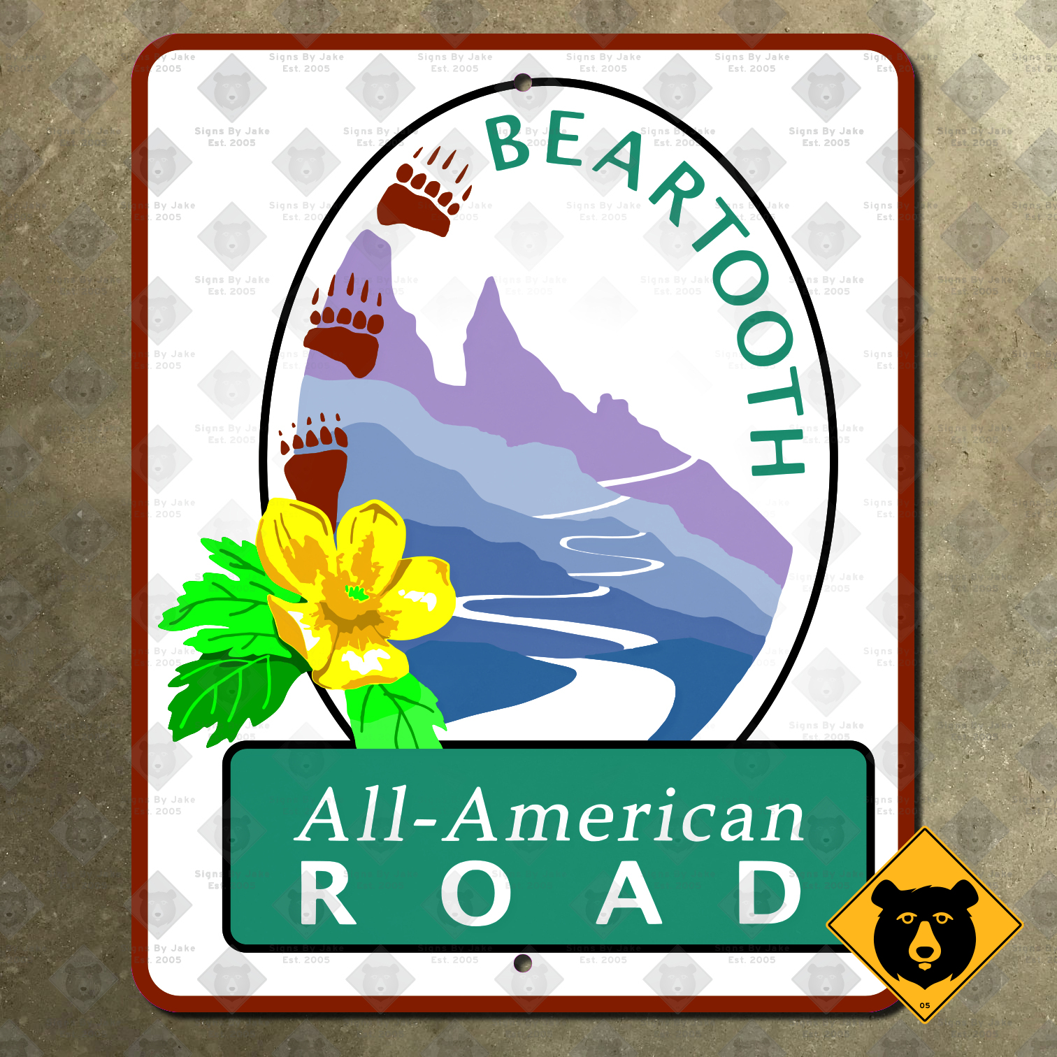 Along with the usual signs for US-212, since 2002, unique signs along the Beartooth Highway highlight its designation as an All-American Road. These signs show a artistic rendition of US-212 making its ascent up Beartooth Pass. This iconic scene is complemented with bear pawprints and a native wildflower.