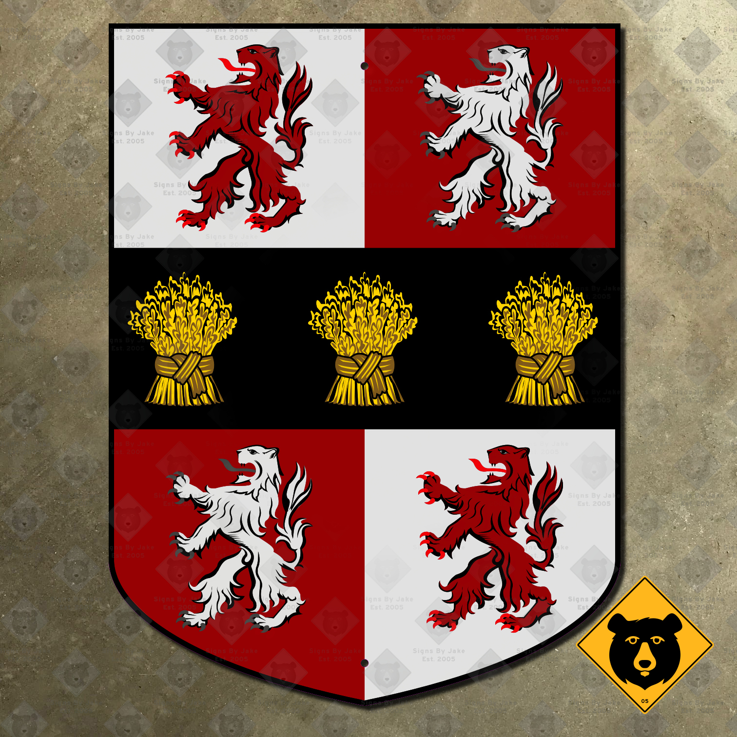 The family name Murphy dates back many centuries. It means “sea warrior”, and to this day, it is the most common last name in Ireland. The family coat of arms dates from nearly the same time. Its blazon is recorded as quarterly, argent and gules, four lions rampant countercharged, on a fess sable three garbs or. In regular English, that’s a shield split four ways, the quarters alternating red and white, each with a lion of the opposite color. A black field in the middle contains three gold bundles of wheat.