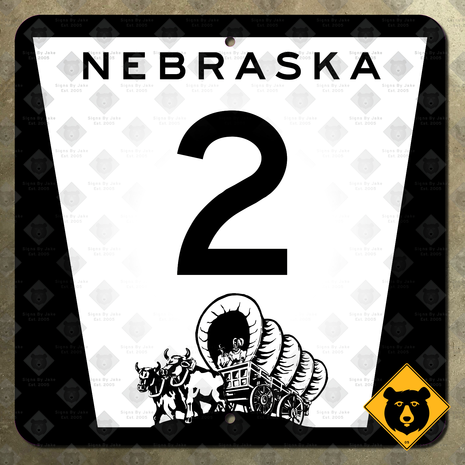 Our Nebraska Highway 2 sign is made according to the standards used along highways in the Cornhusker State since 1975 or so. Every detail of the design, including the finer details of the Conestoga wagon, as well as the relative sizes of the various sign elements and the fonts used, are all just like the originals. Our marker is a great way to get an excellent display piece, without risking legal trouble, and while leaving the originals in place to serve the public.