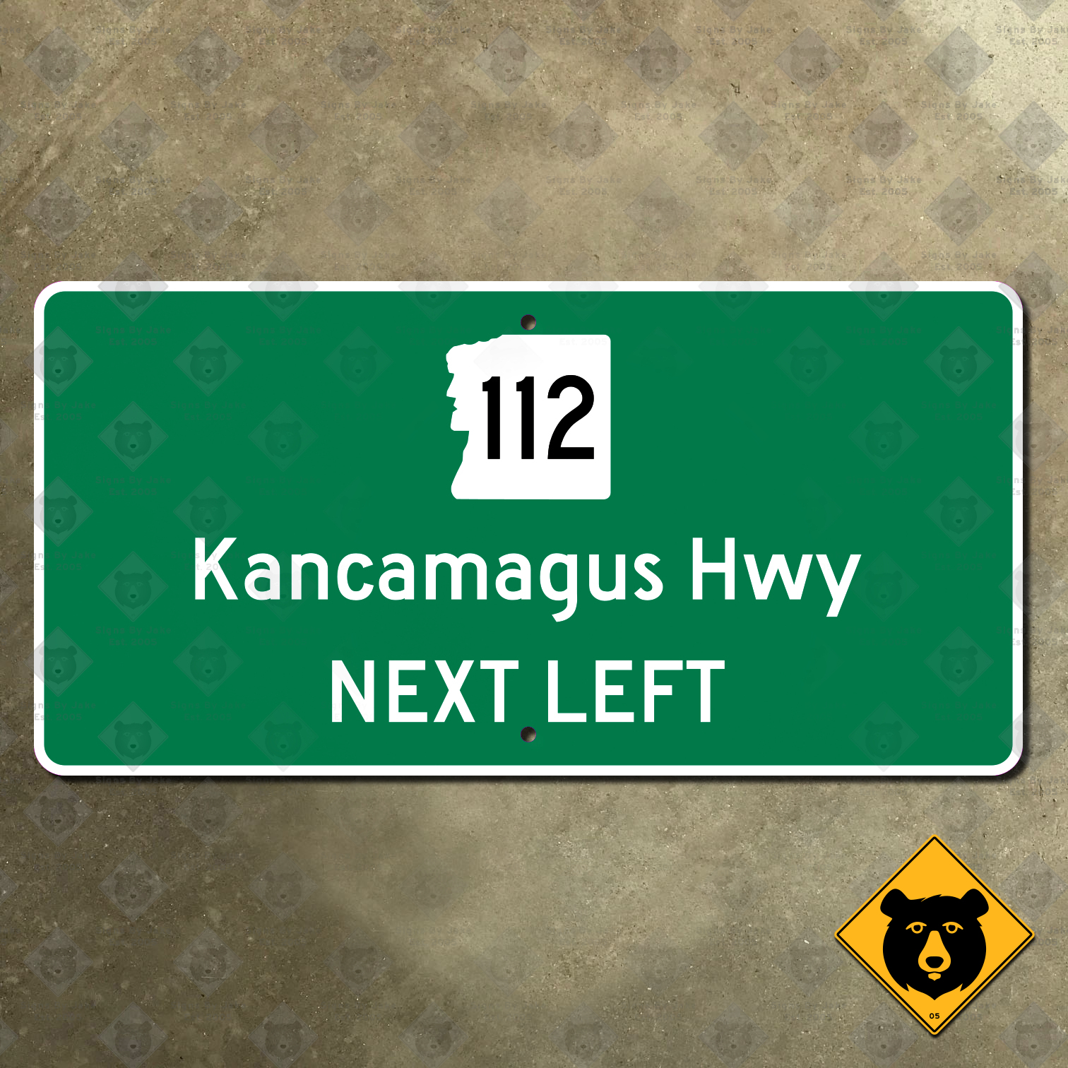 We’ve recreated one of the guide signs pointing visitors to the Kancamagus Highway. Above the highway’s name is the emblem of New Hampshire Route 112, the number “112” in the outline of the Old Man of the Mountain. Below the highway name is the guidance “Next Left”. Our sign is an exact duplicate of the signs found in the field, made to the exact state standard used since about the mid 2000s.