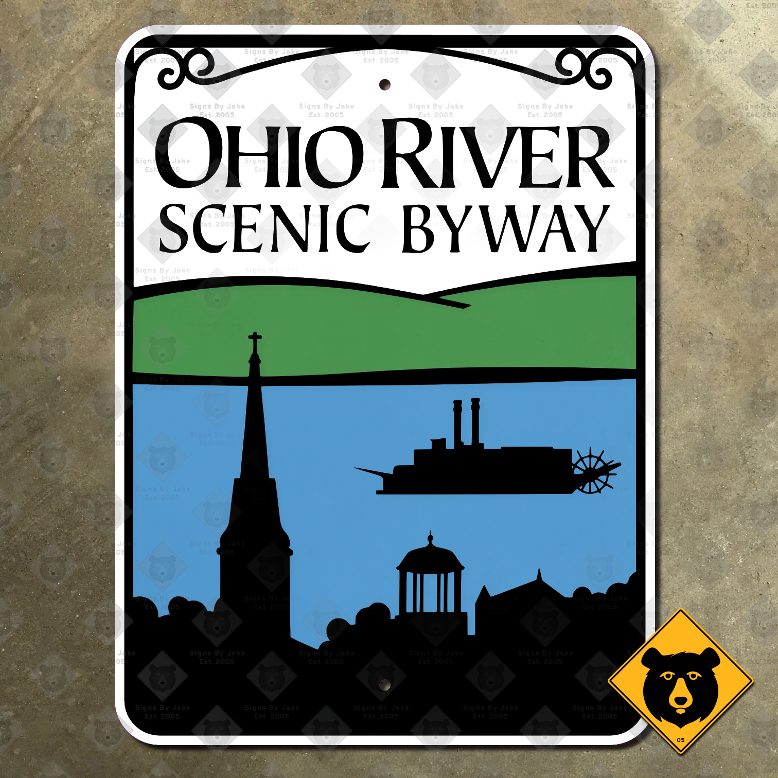 All three states the highway passes through, mark the Ohio River Scenic Byway with a sign unique to this route. It depicts a riverfront scene, complete with a traditional steamboat. In the foreground are buildings representing one of the many small towns along the river, complete with church steeple. Now you can relive your travels along the mighty Ohio by adding this sign to your collection.