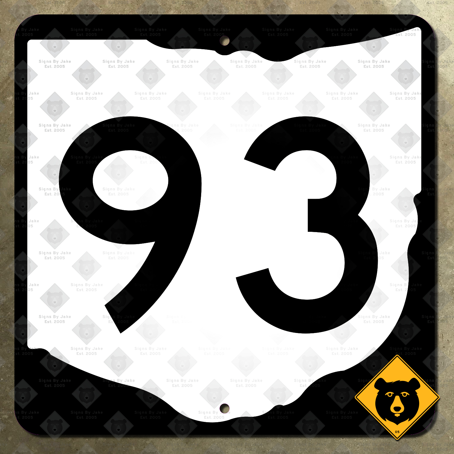 Our State Route 93 sign is flat printed on heavy 14 gauge steel. Its durable, non-reflective finish stands up to the harsh elements outdoors, while still looking great indoors. Choose one of four sizes: 12, 16, 24, and 36 inch square. (Real signage is normally 24 inches; 36-inch versions normally appear in places like freeways where high visibility is essential.) Each size contains two mounting holes for your convenience. (Looking for an older version of this route marker? Or perhaps one just like this for another number? Or a state route marker from a different state? We can help with all of those! Just ask Jake to get started on your custom order!)