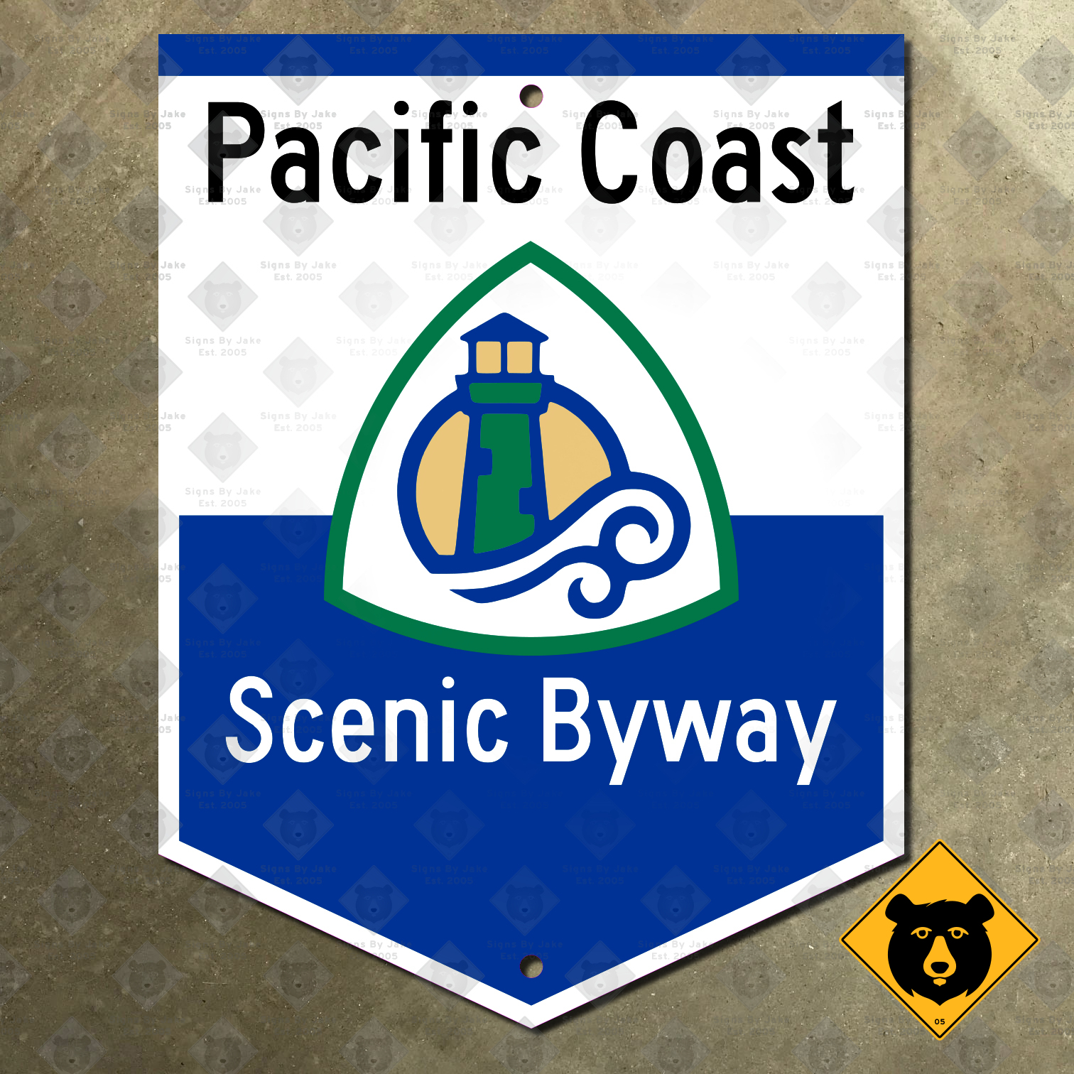The Oregon Department of Transportation (ODOT) marks the Pacific Coast Scenic Byway with special five-sided markers. These signs bear the image of a traditional lighthouse looming over the ocean waves in front of a setting sun. These markers can be found along the highway throughout its entire length in Oregon. Now, to help you relive your experiences along this one-of-a-kind road, you can get one of your very own.