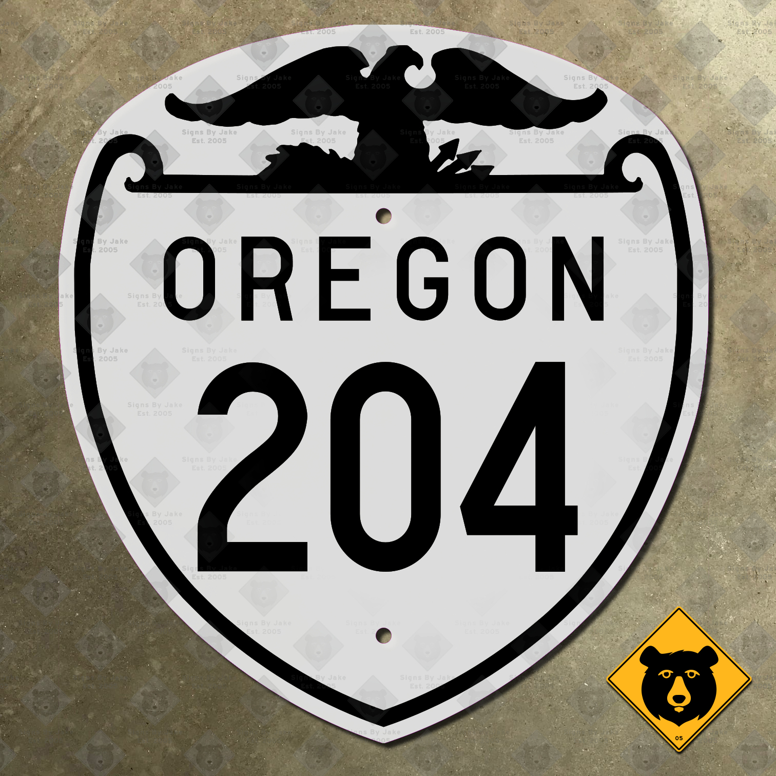 Our Oregon Route 204 sign is a high quality, heavy steel sign, flat printed right here in the United States. It features a glossy, non-reflective coating that protects it from the elements. Display it indoors or outdoors with no problems at all! Mounting holes are included, making installation easy. We offer it in the following sizes: