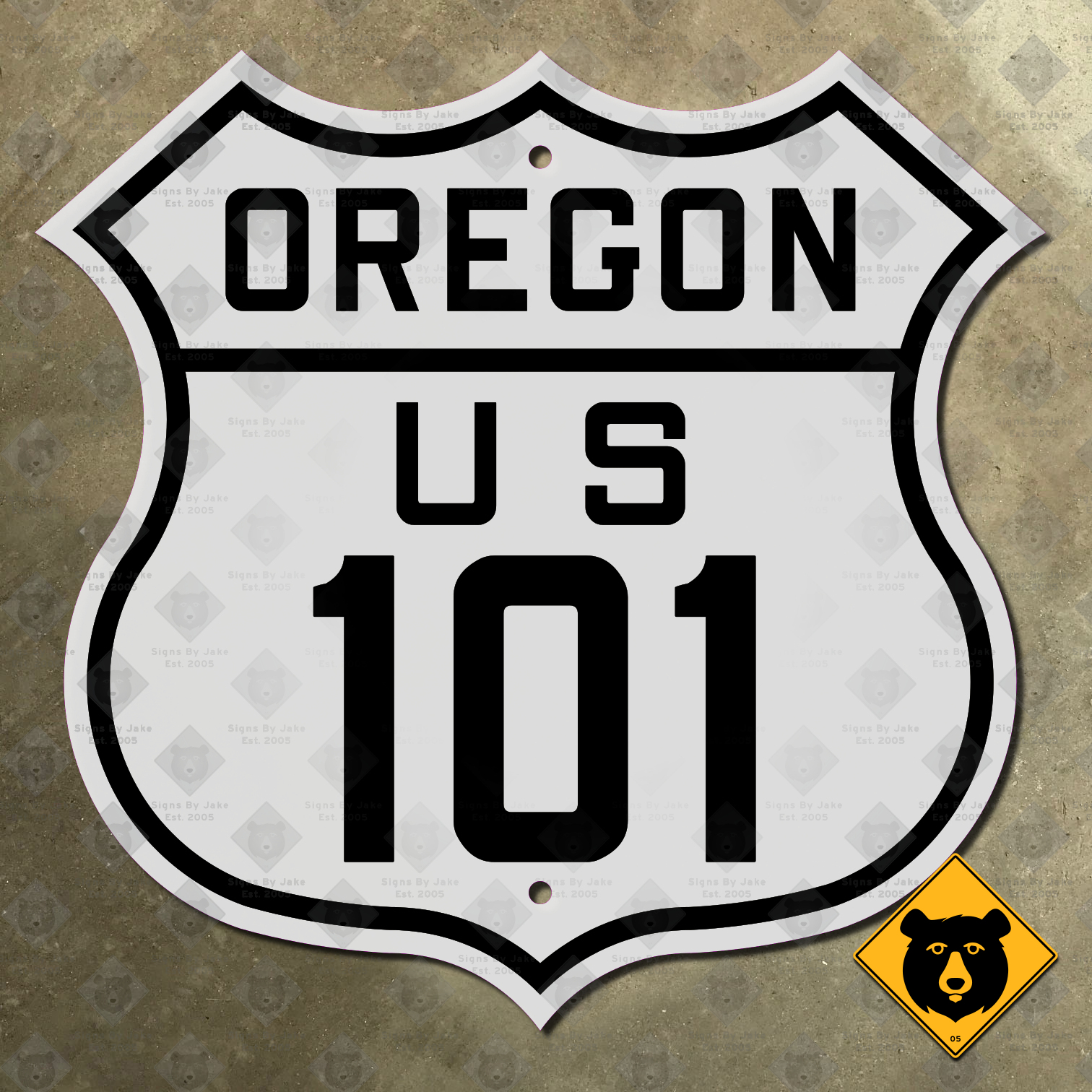 Our Oregon US-101 marker is flat printed on heavy 14-gauge steel. Its high-gloss, non-reflective finish evokes the look of the porcelain signs of yore. This sign is durable enough to withstand the elements outdoors, while looking excellent indoors. We offer this sign in four sizes. For maximum historical accuracy, choose the 16-inch-tall model; this is the size of most signs of this type posted in the field. We also offer a scaled-down 12-inch-tall version, and larger 24- and 36-inch sizes (which were sometimes used to aid in visibility). All four versions include mounting holes for your convenience. (Want a sign like this for another highway, in Oregon or elsewhere? We’re happy to make one! Just contact Jake to get started on your custom order.)
