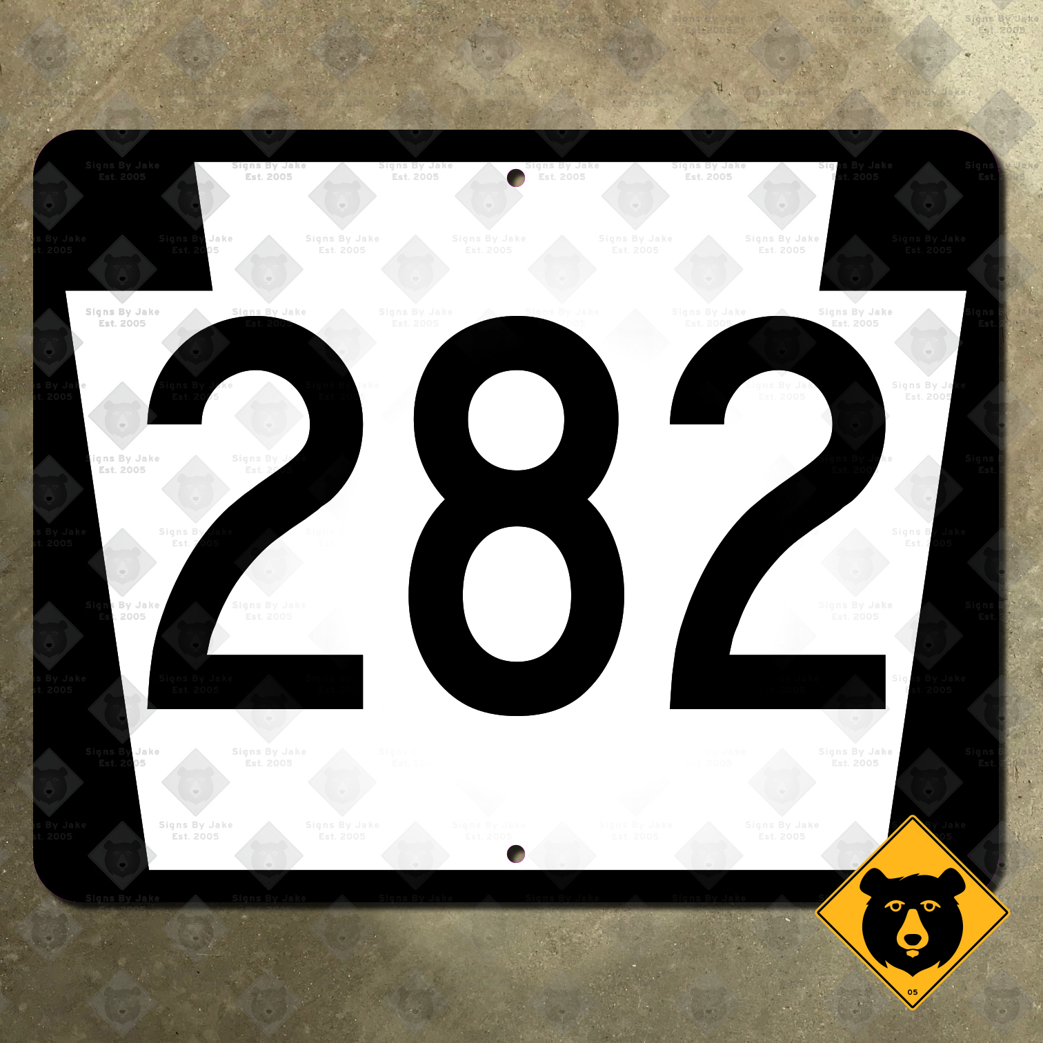 Our Pennsylvania Route 282 sign is flat printed in the USA on heavy 14-gauge steel. Its glossy, non-reflective coating can withstand the elements, rain or shine, for years to come. We offer this sign in four sizes, with mounting holes pre-drilled for your convenience: