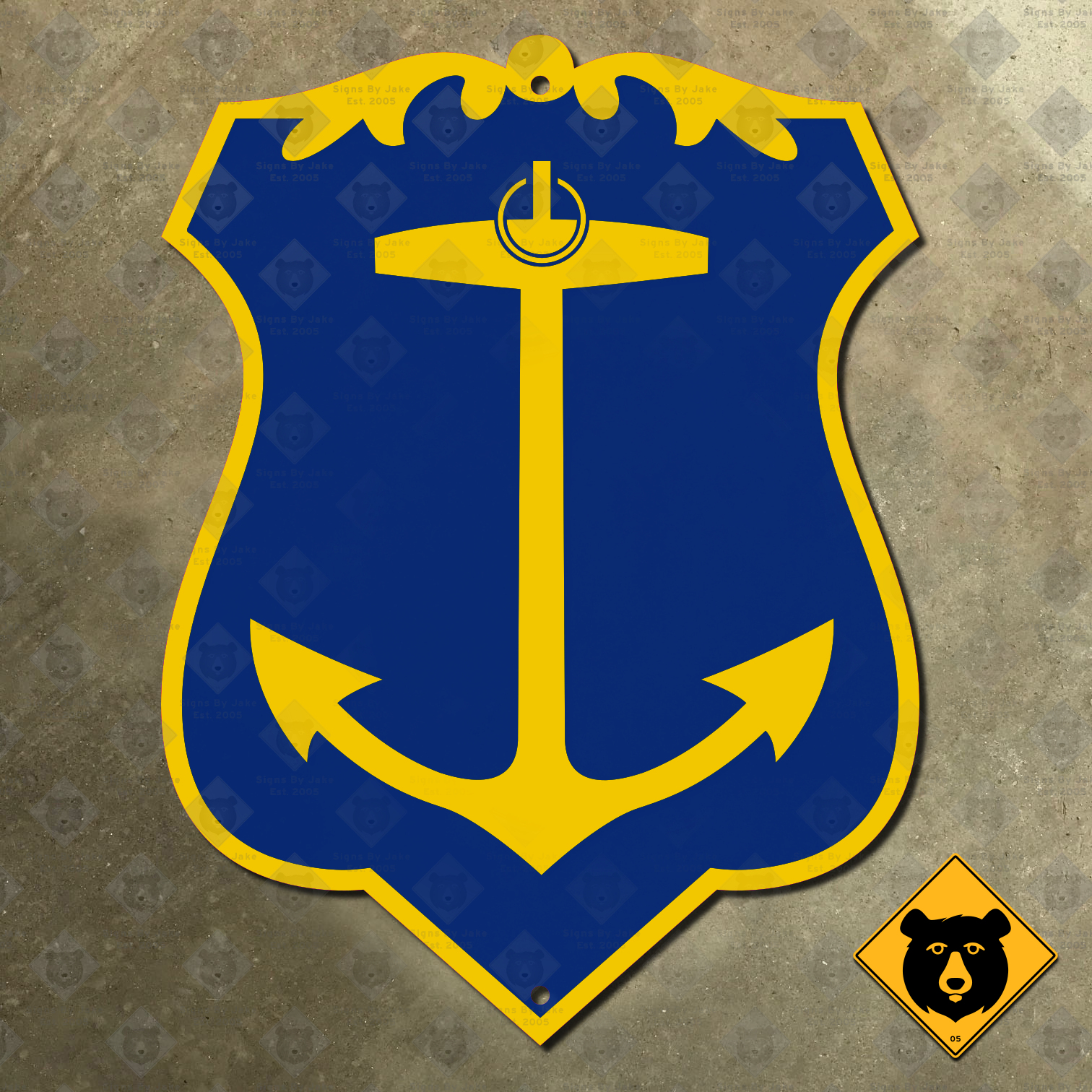 Our Rhode Island coat of arms sign depicts the state’s anchor symbol in yellow on a blue background. The distinct shape of the sign is found in many places the anchor is used, including in the seal and flag of the governor. This sign is an excellent addition to any space where you’d like to show your love for the state of Rhode Island!
