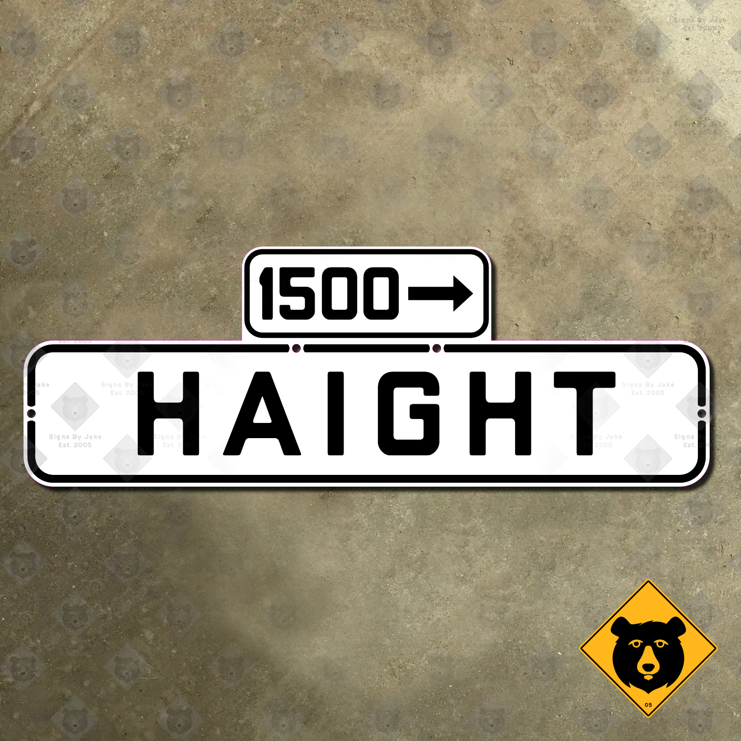 We’ve made two versions of the famous Haight Street sign. One is made according to the 1946 specification, which was still in service during the heyday of the hippie era. We also offer the newer 1965 specification used by the City of San Francisco on later issues. (This was the last style of all-capitals signage, before they went to mixed case in 2009.) It carries the block number 1500, where the intersection with Ashbury Street is located.