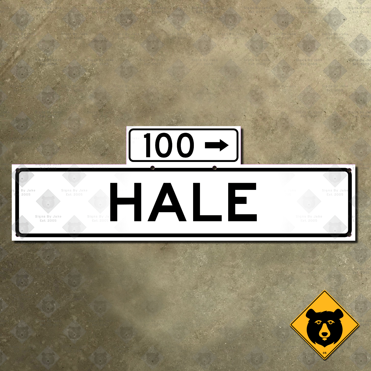Our Hale Street sign is a precise replica made according to the classic 1965 specification for San Francisco street signs. These signs are white with black, all-caps text, in the standard road sign fonts. The block number 100, signifying the intersection with Barneveld Avenue, appears in a tab above the main body of the sign. Our Hale Street sign is printed in the United States on heavy 14-gauge steel. It’s durable enough to be installed indoors or outdoors, and has a glossy but non-retroreflective finish. Pre-drilled holes are included for easy installation. Choose from the following sizes: