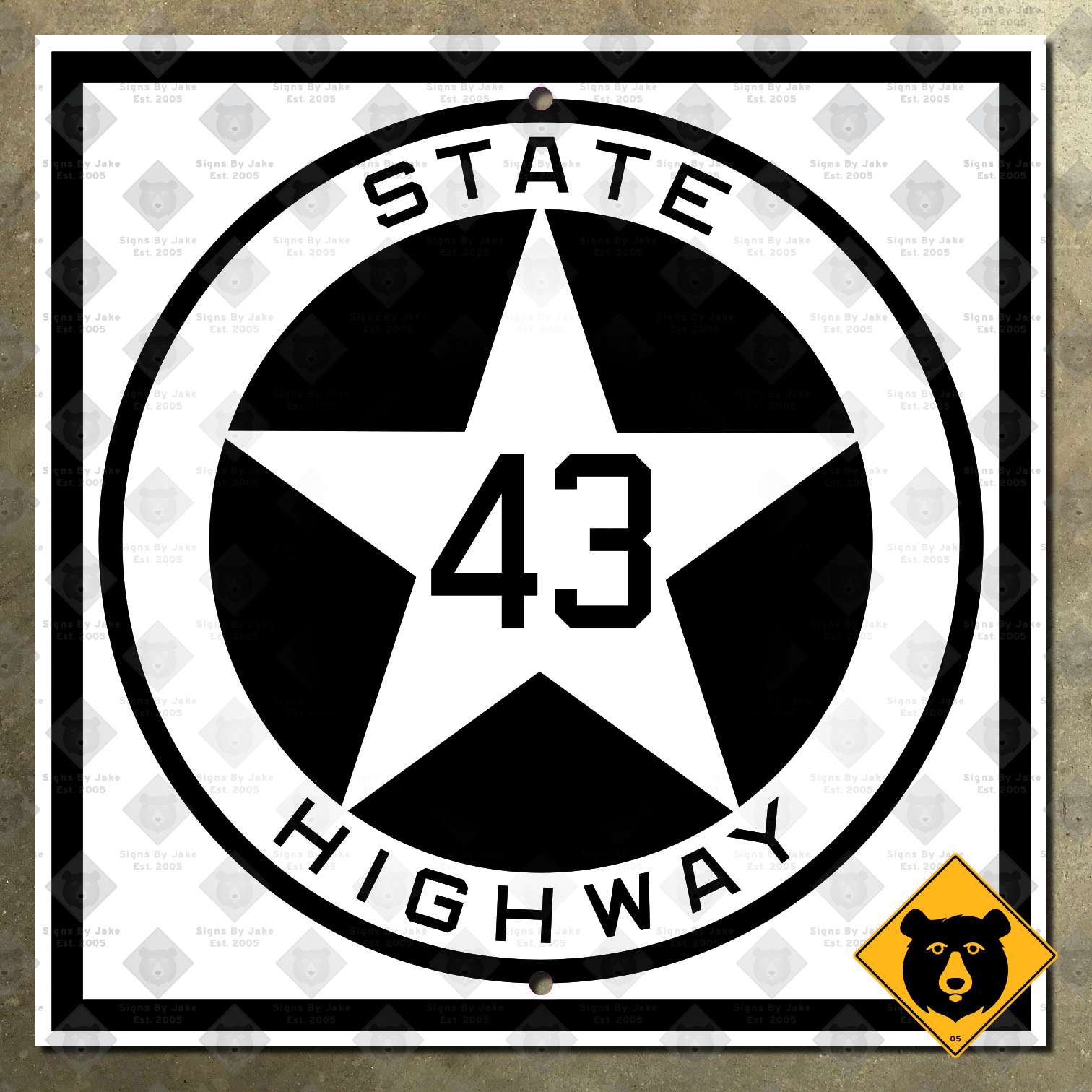 Here we have a Texas State Highway 43 sign in the 1920s style. In 1921, when state highways were an emerging new entity that needed to be cared for and maintained (at least, as a highway and not a dirt/gravel trail), several states got creative with their signage to designate these highways. Texas was one such state. The design chosen for every state highway in Texas was a star (presumably to represent the “Lone Star” in the Lone Star State), surrounded by a circle and the words “State Highway”, all contained neatly in a black and white square. Unfortunately, while being a neat design, the readability on the roads was less than ideal. Now Texas uses a plain square with a bold black border around the edges and the numbers in the middle. To be fair, the plain square is more readable at highway speeds, but it lacks the design flair of the 1921 star design. Celebrate the days when interesting designs like this were posted at frequent intervals along the Texas State Highways by adding this elegant reproduction sign to your home, garage, den, or bar today!