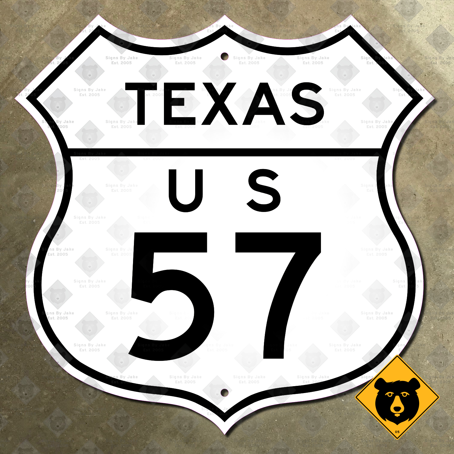 Our high-quality Texas US Route 57 signs are flat printed on 14-gauge steel, with completely accurate layout and fonts. We’ve made this one available in four sizes, from 12 inches up to 36 inches. It is non-reflective and a perfect display piece, indoors or outdoors. If you’d like a sign like this with a different state name or route number, just contact Jake! We can also make signs with embossed lettering or embedded reflectors.