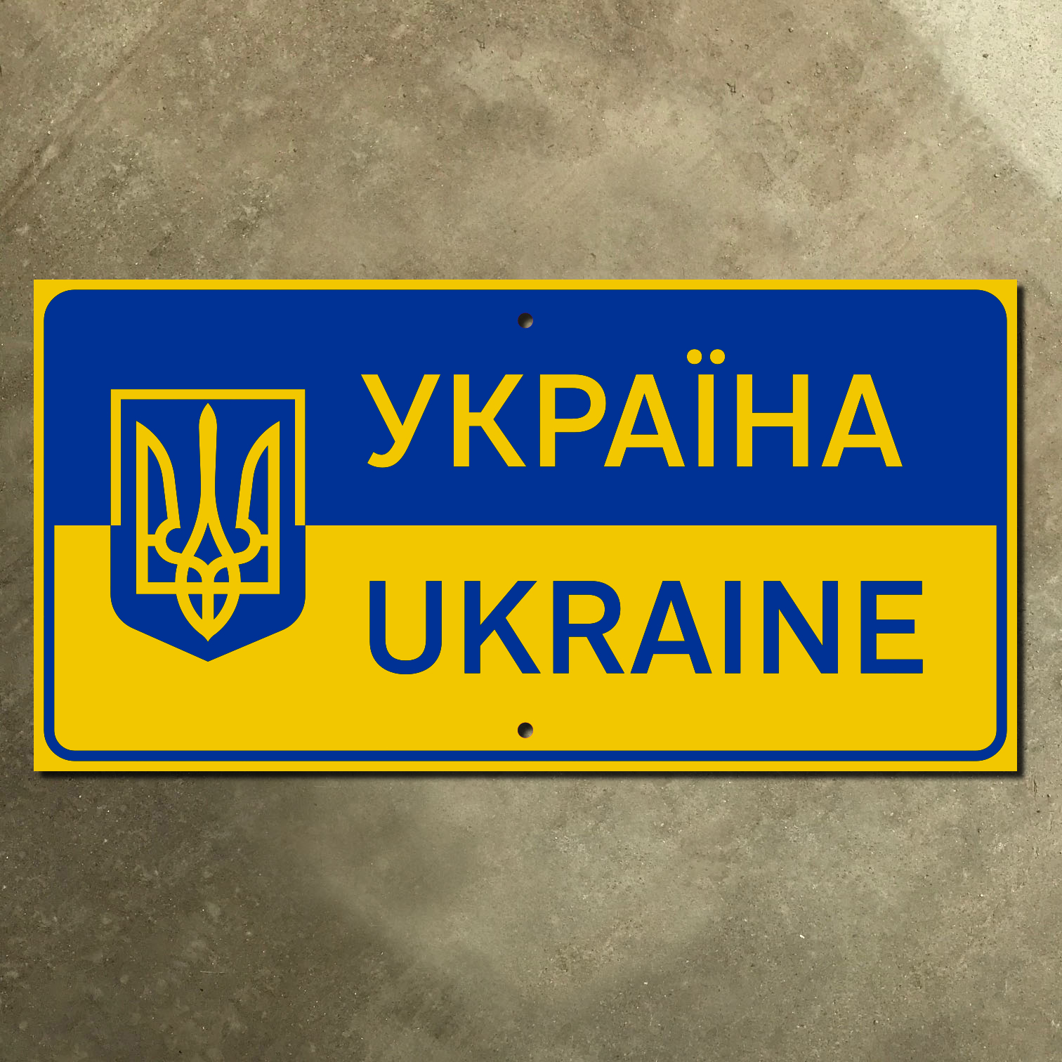 We’ve recreated the Ukraine international border marker according to exact Ukravtodor standards. Our recreation of this sign is printed on heavy 14-gauge steel. It uses the standard Ukrainian signage fonts in use as of 2021. It is available in sizes from 16 in. × 8 in. all the way up to 72 in. × 36 in. Each version contains mounting holes for your convenience. It is a non-reflective sign—perfect for enjoyment indoors or outdoors. (Looking for another international border sign? Or would you like this sign in a size not shown here? Contact Jake to place a custom order.)