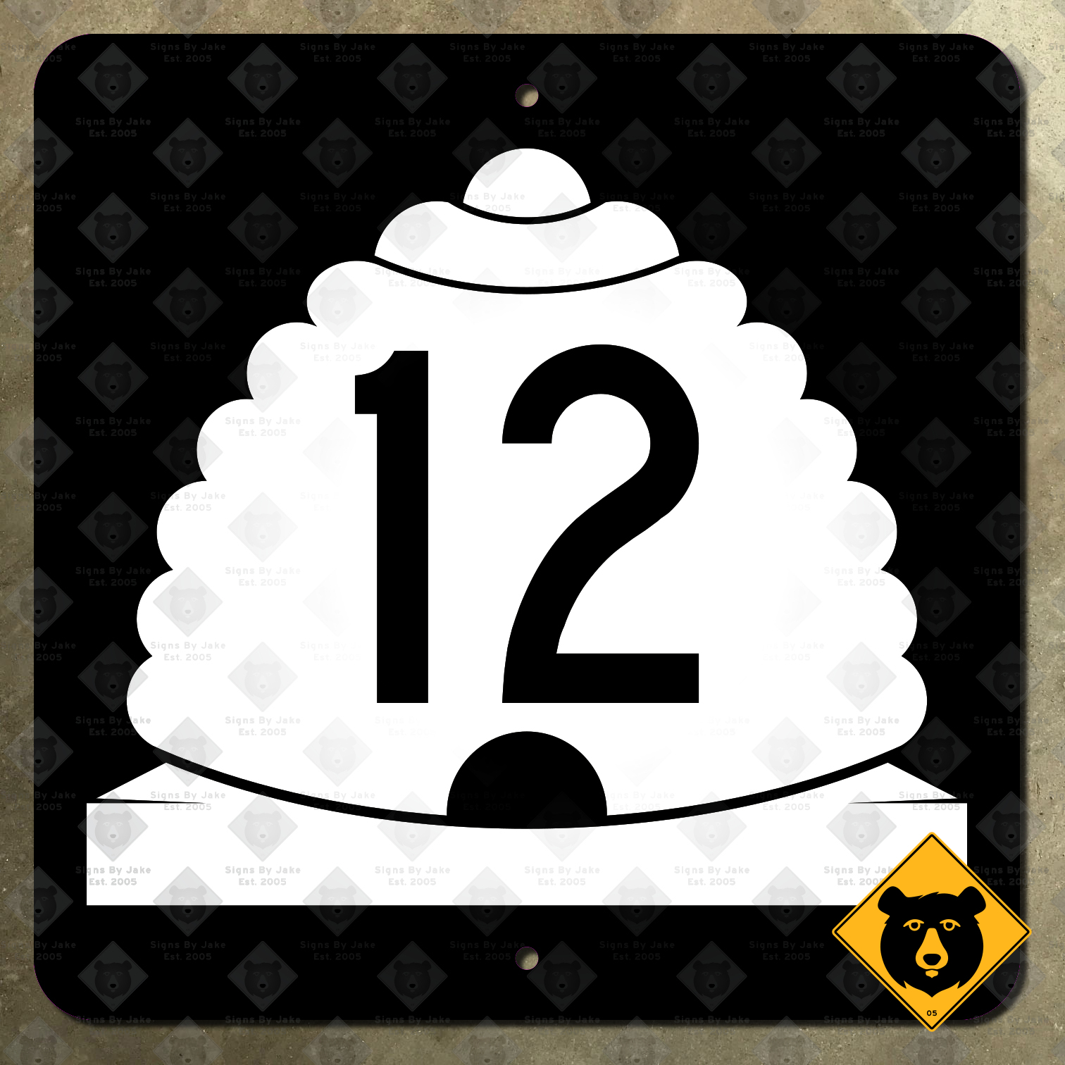Our State Route 12 marker is flat-printed on heavy 14-gauge steel. The printing process we use results in a non-reflective sign that is durable enough to withstand the elements, but looks great indoors as well. We’ve made it available in sizes from 12 inches square all the way up to 36 inches square. (For comparison, most signs you’ll find along the road are 24 inches square.) Two pre-drilled holes for easy mounting are included.