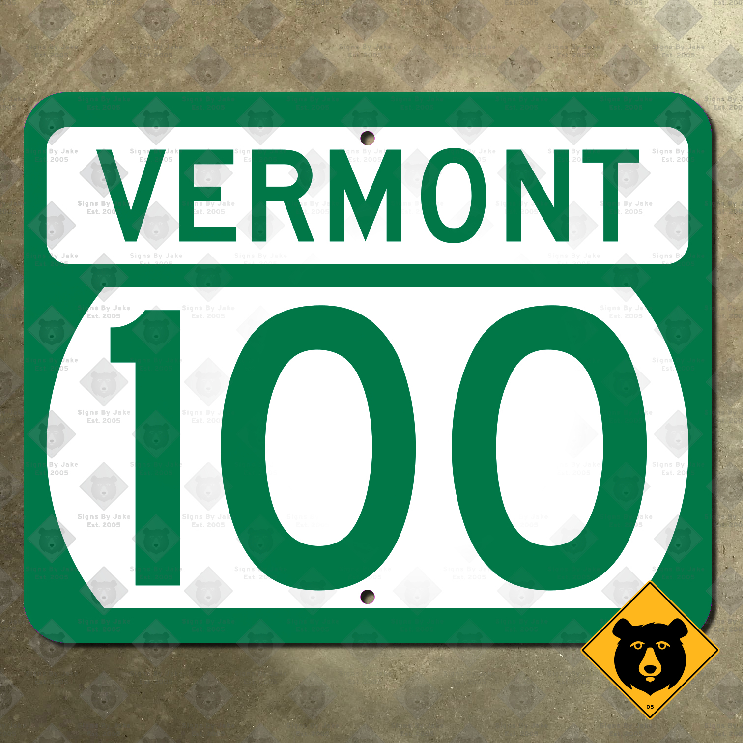Our Vermont Route 100 marker is flat printed in the USA on heavy 14-gauge steel. It will serve you well for years to come, even when installed outdoors in a severe Vermont winter. The original 30 in. × 24 in. size as seen on the road is available here. We also have scaled-down 12 in. × 9.6 in. and 20 in. × 16 in. markers for those looking to conserve space or decorating budget, or go big with our oversize 40 in. × 32 in. sign. All sizes include mounting holes pre-drilled for your convenience.