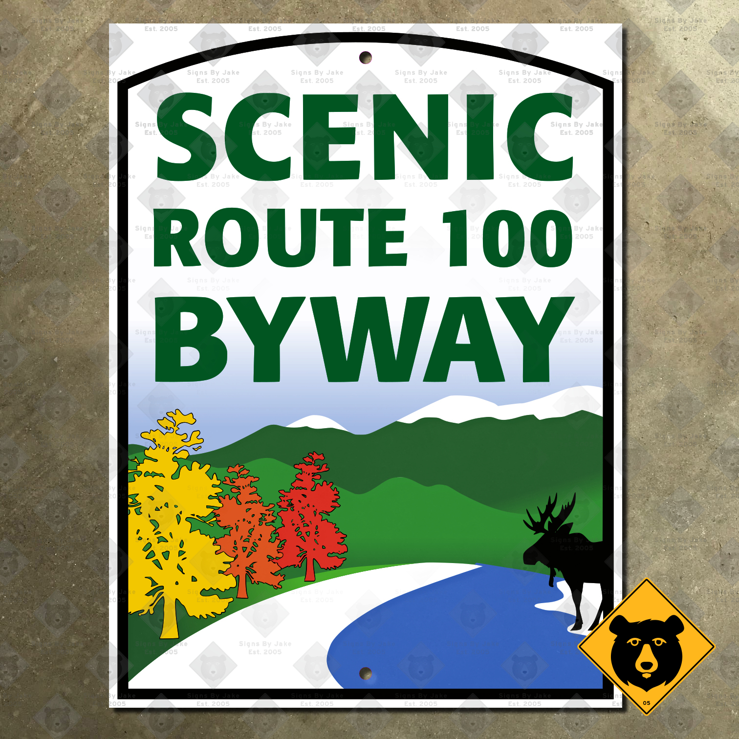Our Scenic Route 100 Byway sign is an exact recreation of the signs posted along this noted scenic byway. You can purchase it in its original size of 18 by 24 inches, as well as our scaled-down 10½ × 14 inch and 15 × 20 inch sizes, and scaled-up 27 × 36 inch size. All sizes include two pre-drilled mounting holes for your convenience. All of them are flat printed on heavy steel to ensure they remain in service as a display piece, indoors or outdoors, for years to come. This sign is non-reflective. If you would like a size not listed here, contact Jake to inquire about a custom order.