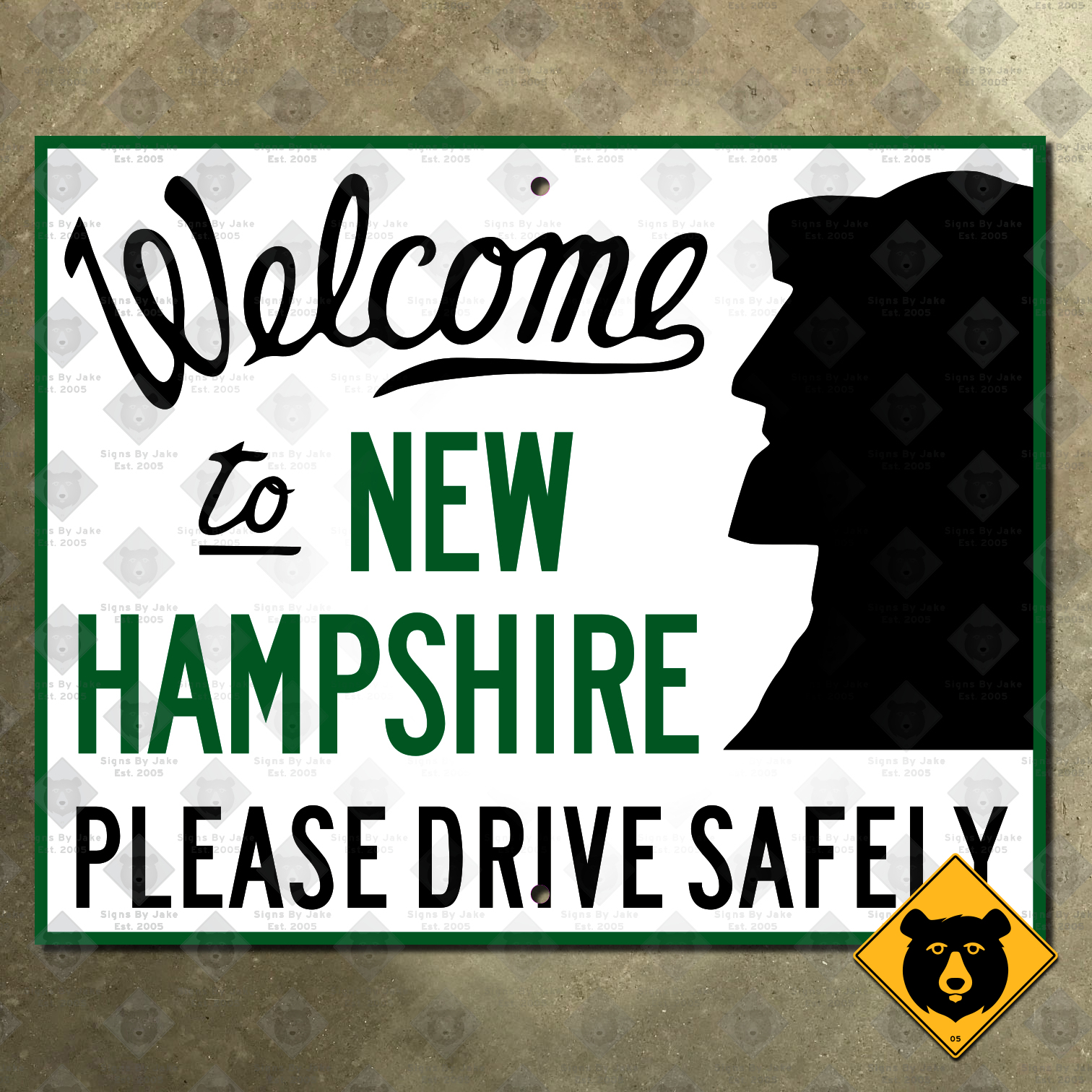 Our Welcome to New Hampshire, Please Drive Safely sign is flat printed on heavy 14-gauge steel. It has a glossy, non-reflective finish that looks great indoors, but will withstand the elements outdoors as well. We’ve also included mounting holes for your convenience. It is available in the following sizes: