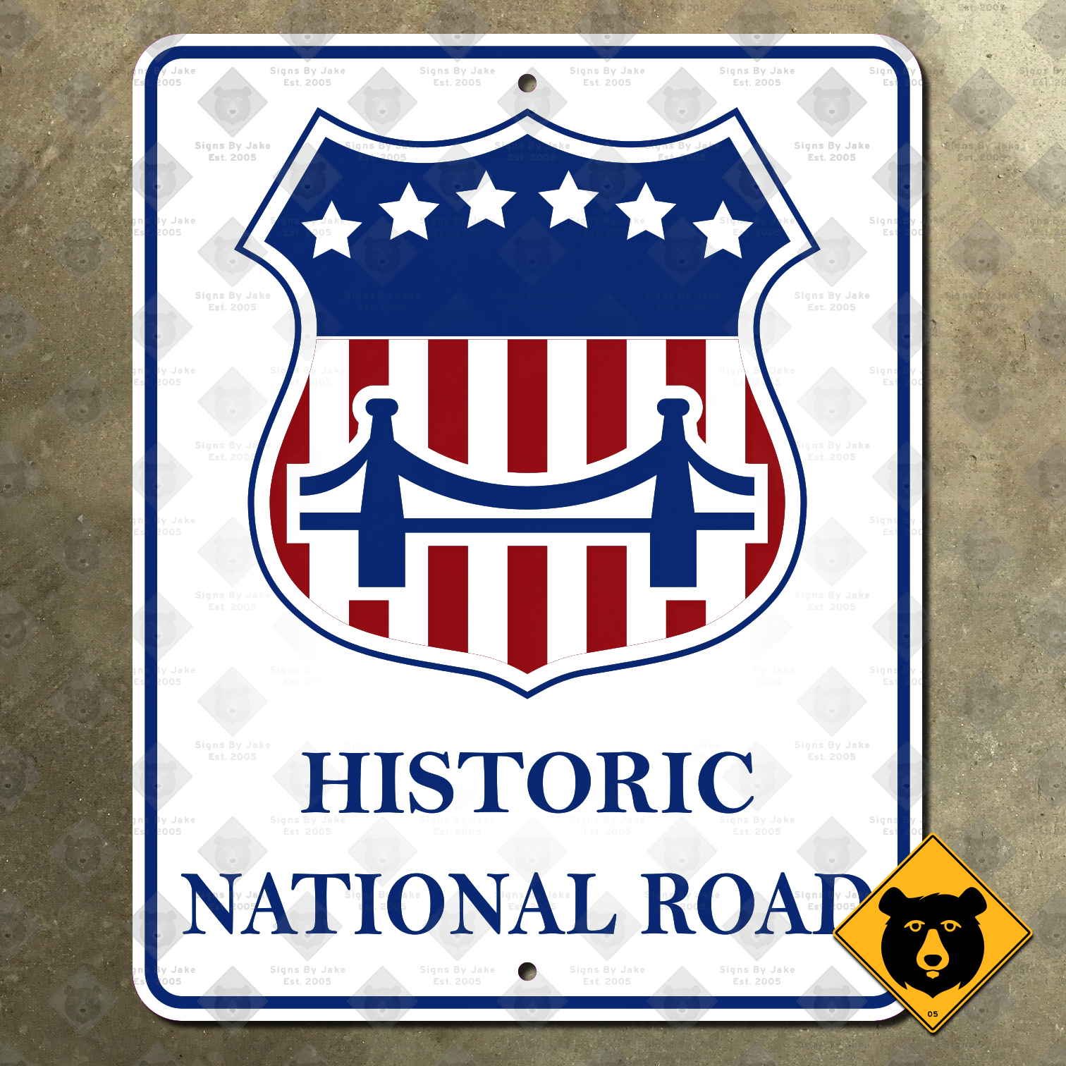 Our Wast Virginia Historic National Road sign is a faithful replica of those marking the route on its brief journey through West Virginia. Made from photos of the sign in use in the field, it include the stars-and-stripes shield used to signify the National Road along its route. It also includes a representation of the Wheeling Suspension Bridge, which the National Road used to cross the Ohio River. Relive your memories of this historic road, or simply add a bit of patriotic flair to any space, with our recreation of this sign.