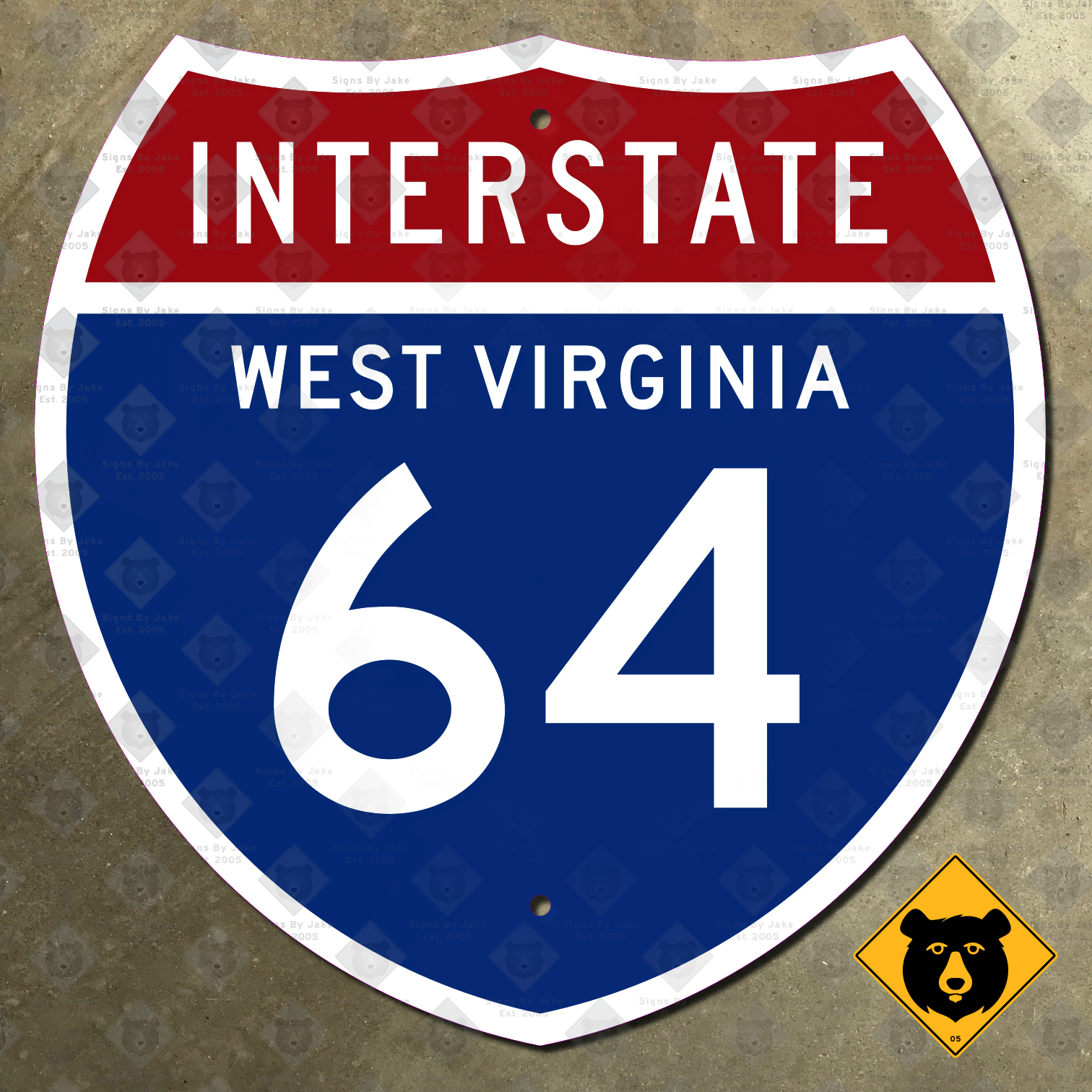 Our West Virginia Interstate 64 route marker is flat printed on heavy gauge steel. It comes in four sizes, from 12 inches square to 36 inches square. It is non-reflective, allowing it to blend in perfectly with non-road-sign home decor. It’s durable enough to withstand the elements outdoors, too. (If you would like a version in a size not listed here, or an Interstate route closer to your home, please ask!)