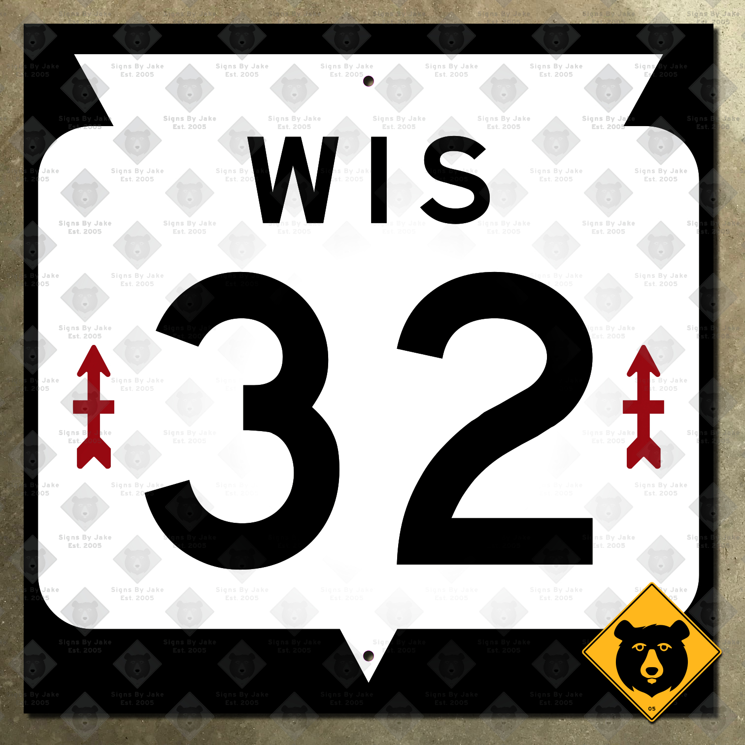Wisconsin Highway 32 crosses the entire state of Wisconsin from north to south. It begins at the Illinois line, continuing onward from Illinois 137. In southeast Wisconsin, it hugs the shore of Lake Michigan, passing through the Racine and Kenosha areas before reaching Milwaukee. From there, it continues northward to the Green Bay area, before finally ending at the border with Michigan’s Upper Peninsula. By an act of the Wisconsin legislature, Highway 32 is also designated as the 32nd Division Memorial Highway, after the National Guard division, composed of Wisconsin and Michigan soldiers, that served in both world wars. The 32nd Division’s insignia was a red arrow piercing a line, commemorating the division’s success breaching the Hindenburg Line in World War I. According to state law, every Wisconsin Highway 32 shield posted must include the red arrow insignia.