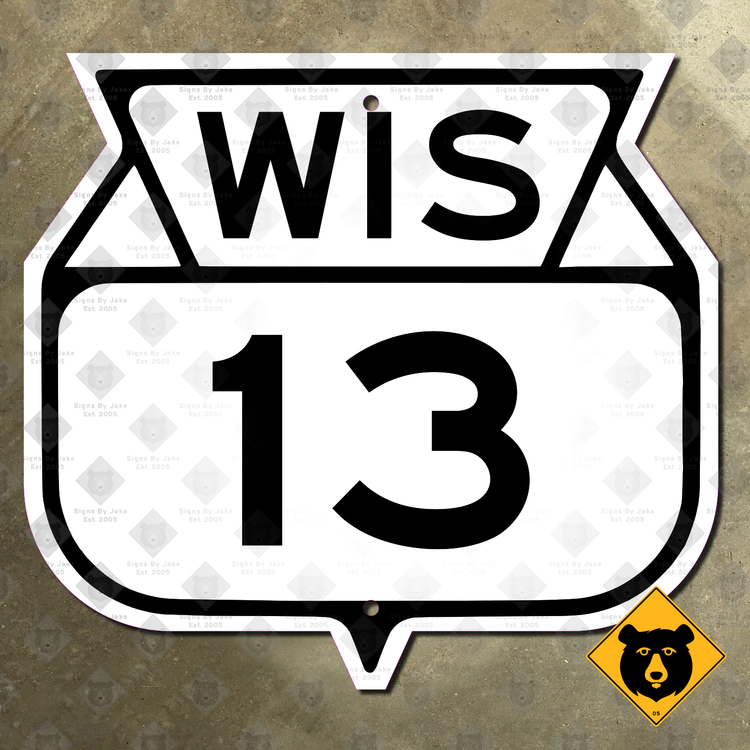 Our Wisconsin Highway 13 sign is made according to the standards used in Wisconsin between 1956 and 1959. It shows the route number, 13, in a geometric figure that later evolved into the present-day route symbol. The edges of the physical sign panel are contoured to the shape of the symbol. At the top of the sign are the letters “WIS”. We’ve pulled out all the stops in making our route marker look exactly like those that once appeared on the highways of Wisconsin. Route markers in this style do sometimes appear on the collector’s market, but they normally go for hundreds or even thousands of dollars. Not only that, but you may have to wait a long time to find a Highway 13 marker specifically. Save time, effort, and money with our faithful replica.